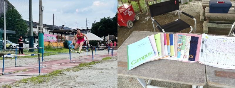 (左)得意なハードルに励んでいます (右)加藤さんが1年生から書き溜めた陸上日誌とルーティン表