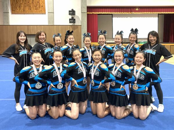 昨年10月の「ジャムフェス ジャパン」の全国優勝、世界大会で4位に輝いた「ANGELS GLORY」のメンバー。 左下から斉藤 愛生さん(星の杜高)、三ツ橋 麻衣さん(陽西中)、岩渕 穂乃果さん(宇都宮清陵高)、宮下 桂音さん(星の杜高)、金子 杏奈さん(作新学院高)、横尾 彩穂さん(星の杜高)。左上から コーチの平井 結菜さん、高山 眸さん、遠藤 紗依さん(旭中)、永田 林檎さん(宇都宮北)、竹内 琉羽さん(壬生町南犬飼中)、植野 真緒さん(作新学院高)、石川 愛怜奈さん(作新学院中等部)、南 きららさん(作新学院高)、代表の鈴木 敦子さん