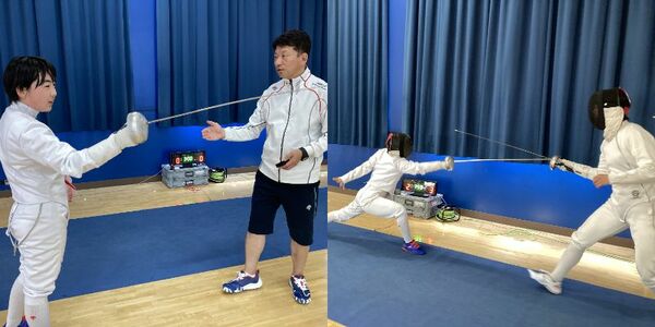 代表の相場さん(右)から一つ一つの動きに関しての確認を受けます。大人相手に練習する石崎さん(左)