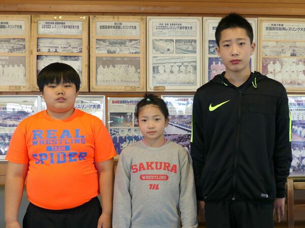 レスリングの全国大会で優勝をしている江泉 凌馬さん、滝田 いろはさん、坪井 大武さん(左から)