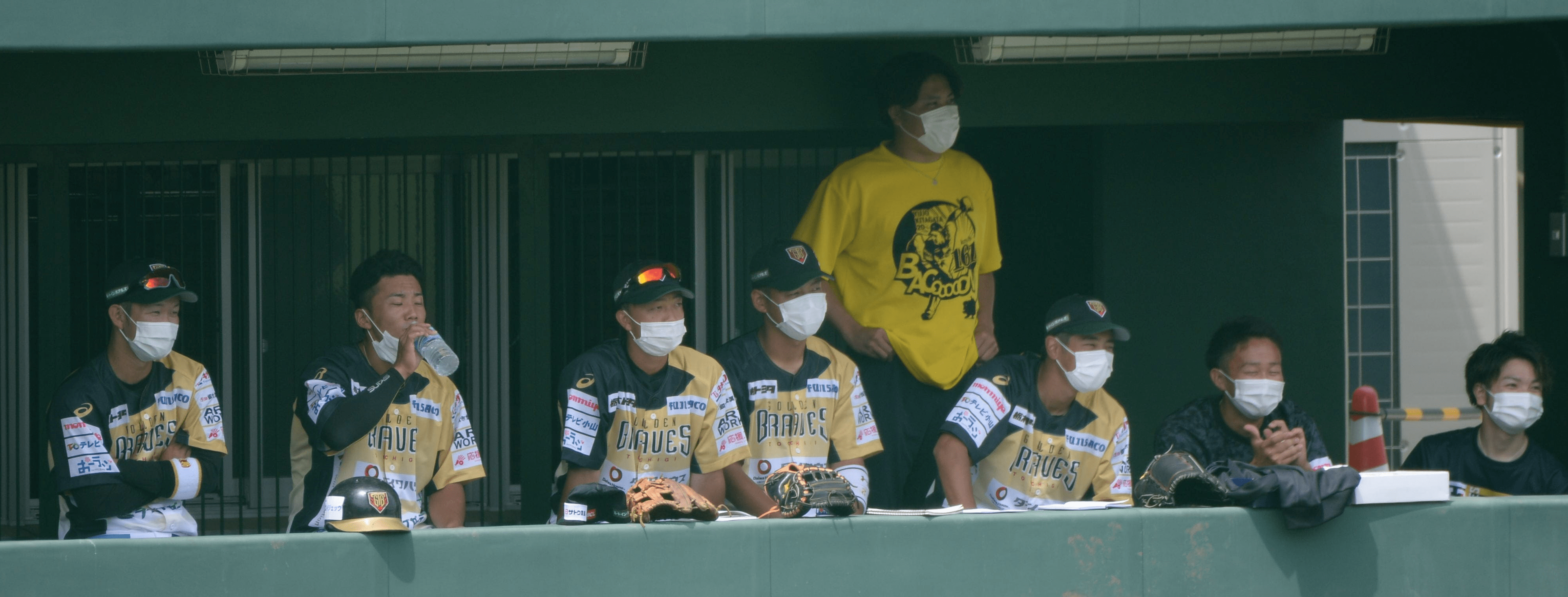 「ソーシャルディスタンス」のためマスクをしてベンチ脇のカメラマン席で戦況を見守る栃木GBの選手たち