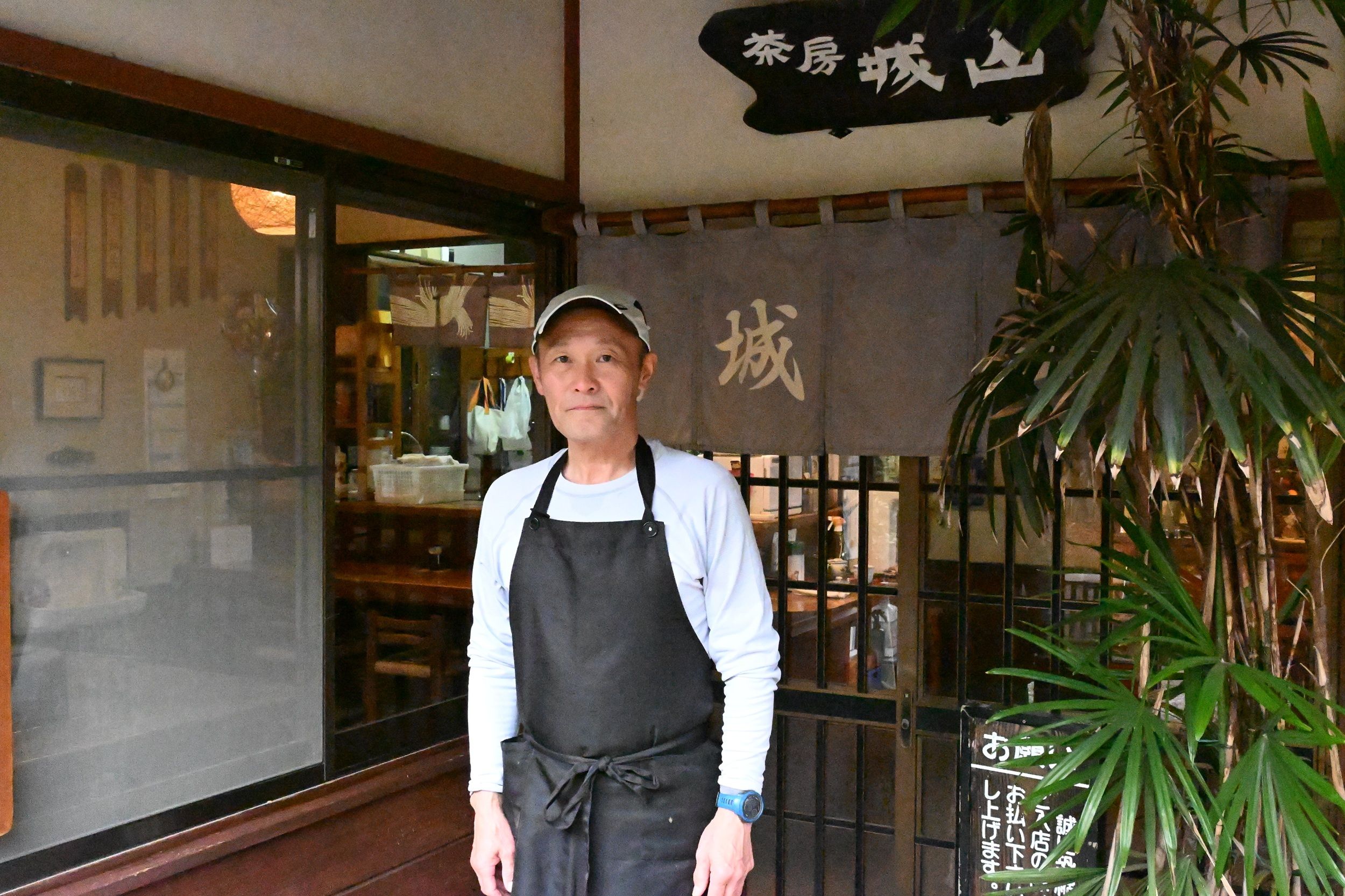 石段を上がった所にある入り口と店長の仲島さん