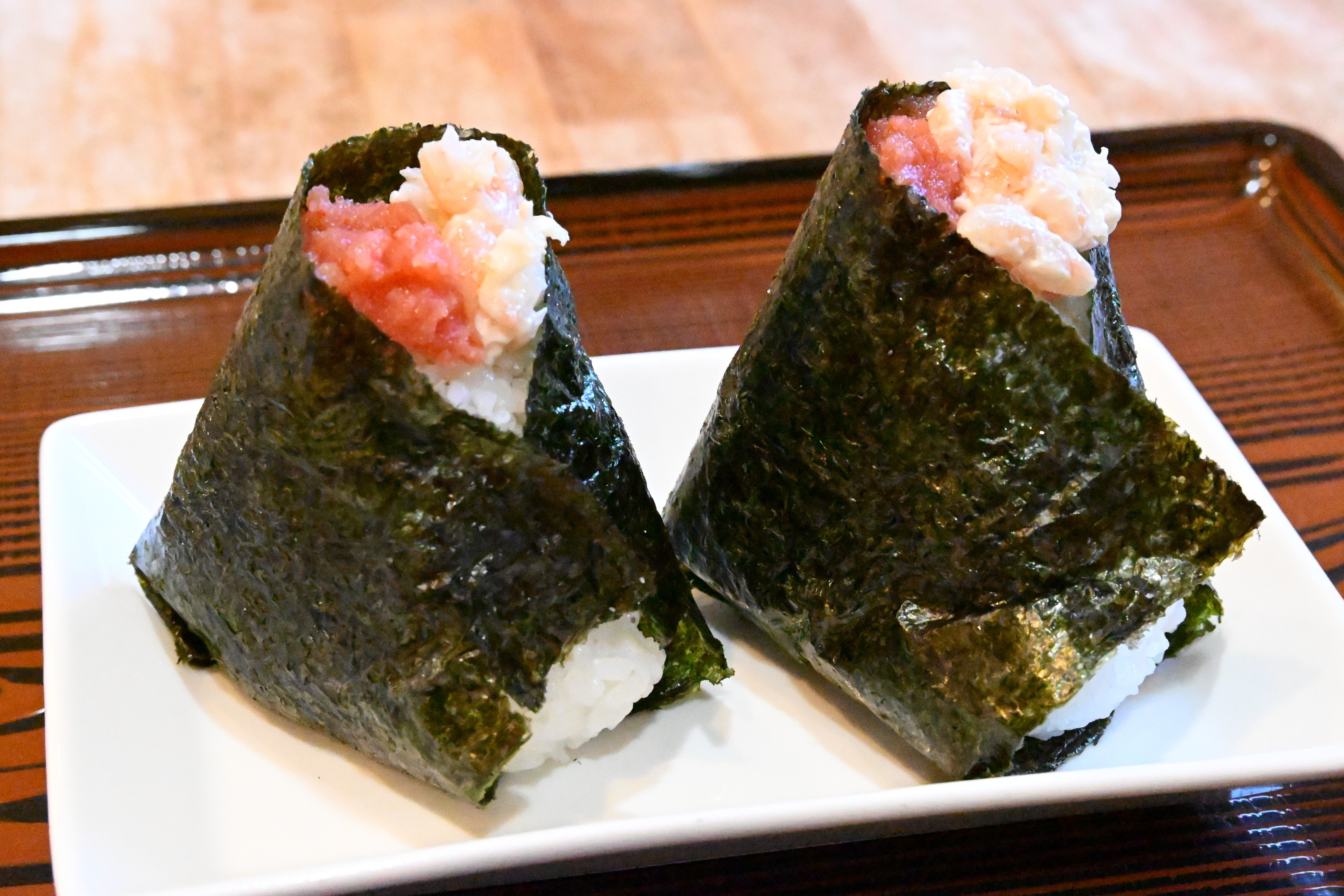 梅こんぶ(左)、エビマヨめんたいこのおむすびと総菜・みそ汁のセット