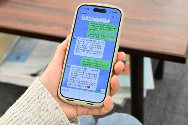 女性と台湾出身の「マーク」を名乗る者とのやりとりの画面=1月上旬、小山市内
