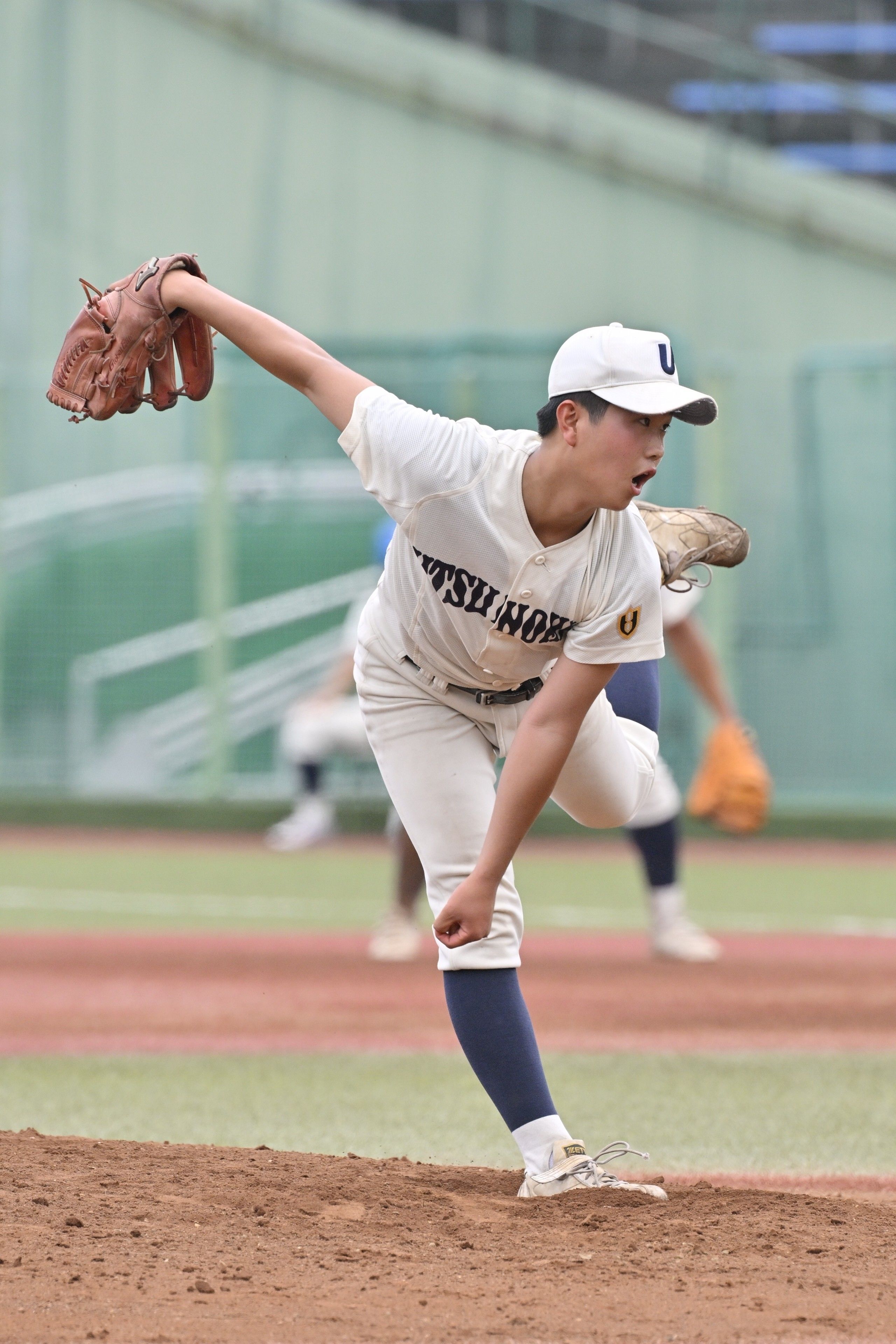 昨年夏の全国高校野球栃木大会の2回戦(矢板中央戦)で8回を投げ、2失点と力投した見目さん=2025年7月17日、清原球場、、広瀬華撮影