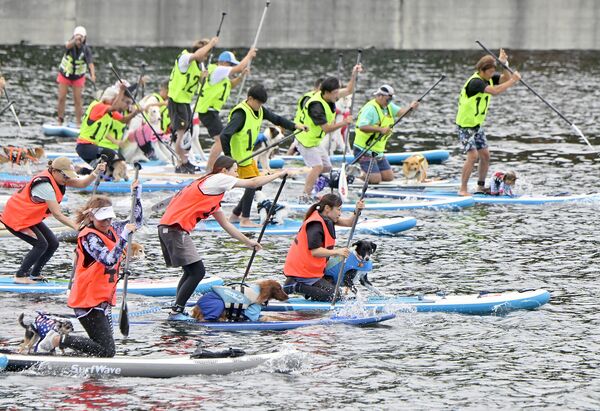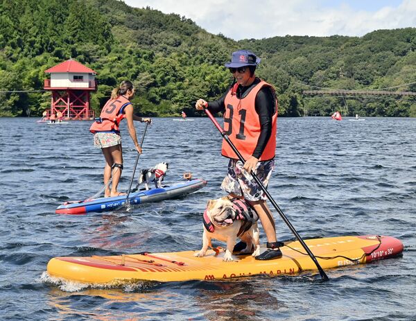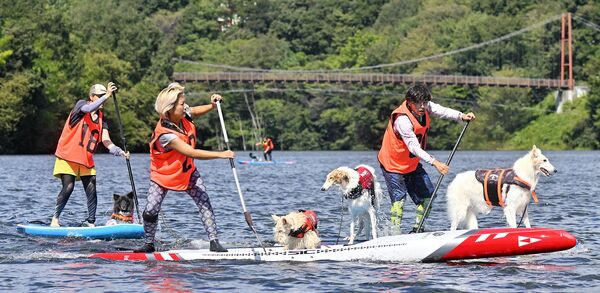 愛犬とボードに乗り、ダム湖を進む参加者=21日午前10時10分、那須町豊原乙、磯真奈美撮影