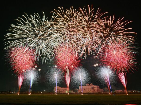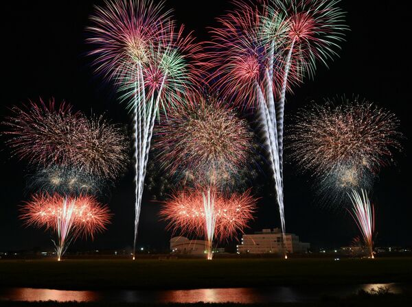 思川河畔の夜空を幻想的に彩った「小山の花火」=23日午後6時55分、小山市小山(約35秒間露光)
