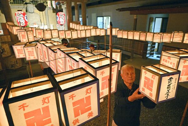 奉納され、境内を優しく照らす灯籠=24日午後6時50分、日光市今市