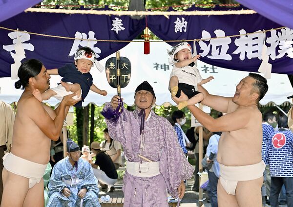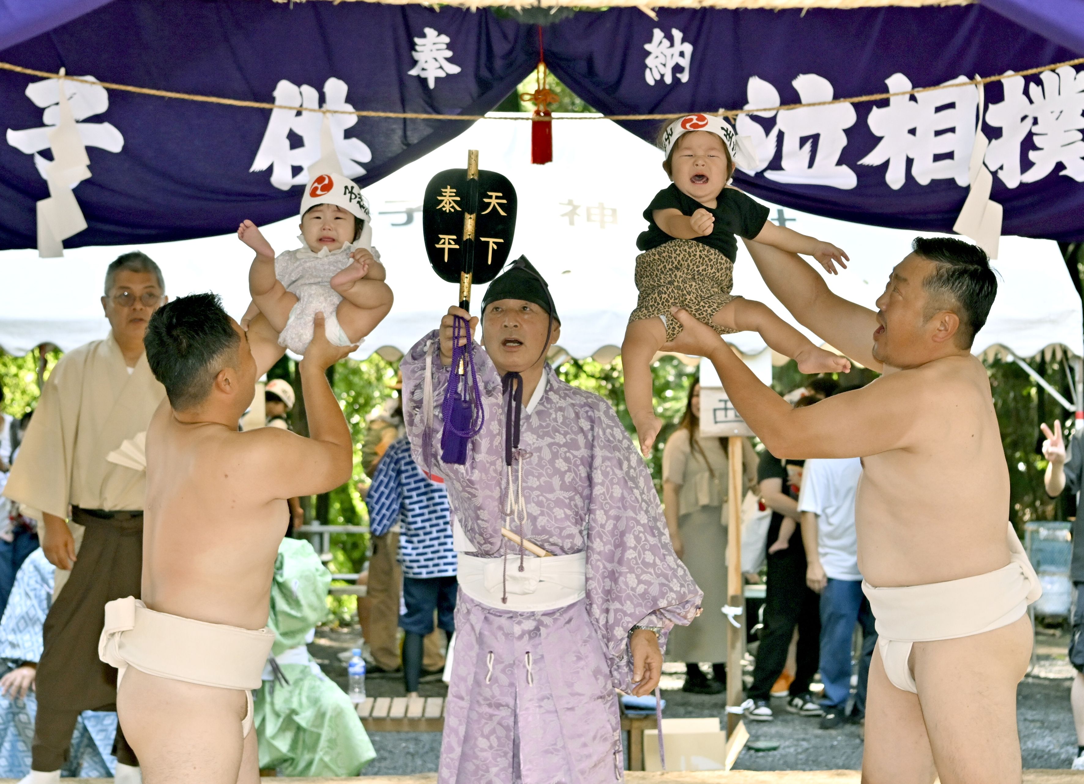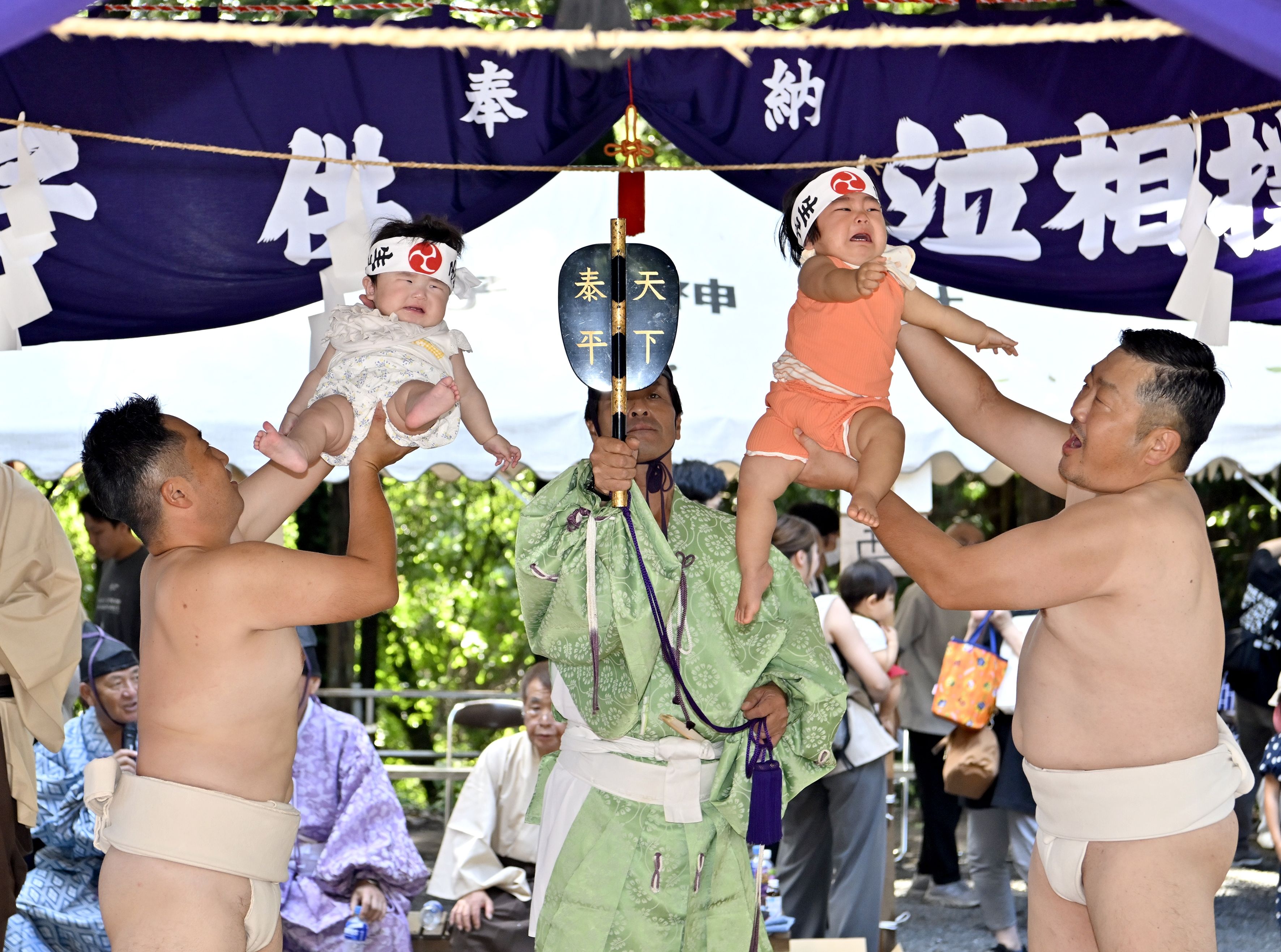 力士姿の氏子に抱えられて、元気な泣き声を響かせる子どもたち=21日午前10時10分、鹿沼市樅山町