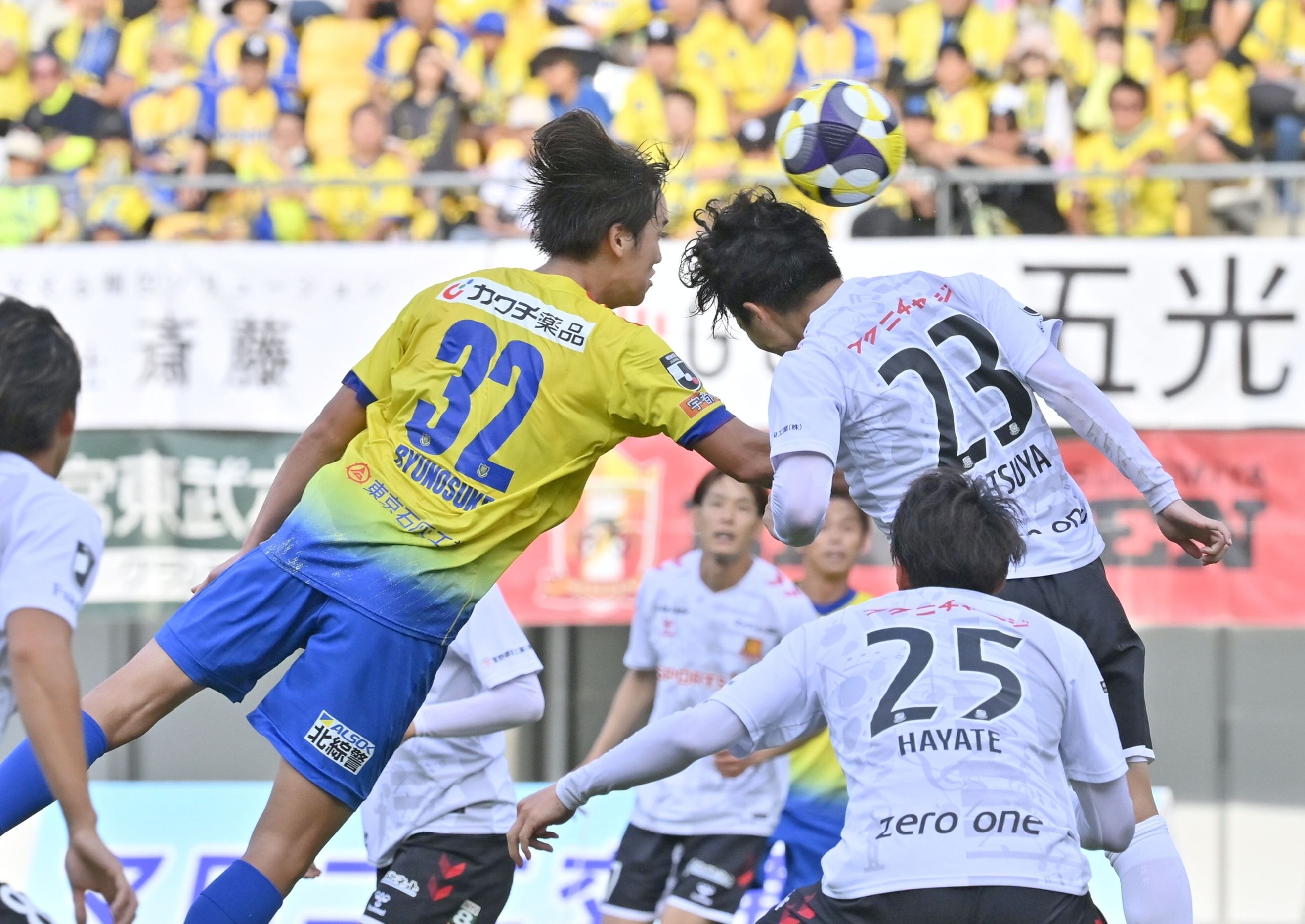 後半33分、栃木SCのFW太田(左)が頭で先制ゴールを決める=カンセキスタジアムとちぎ、広瀬華撮影