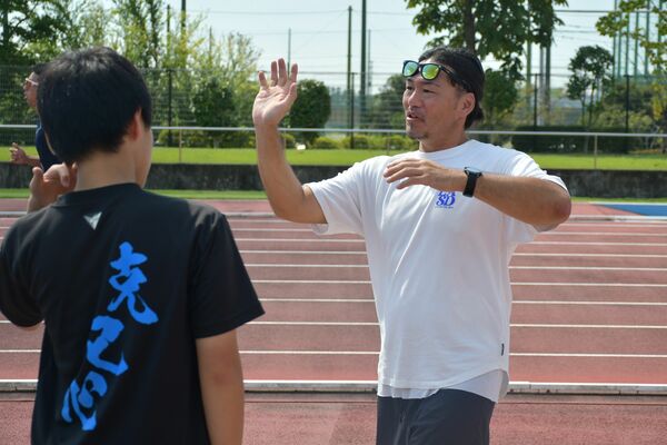佐野市の地域クラブで中学生に砲丸投げの指導をする吉真さん(右)=清酒開華スタジアム