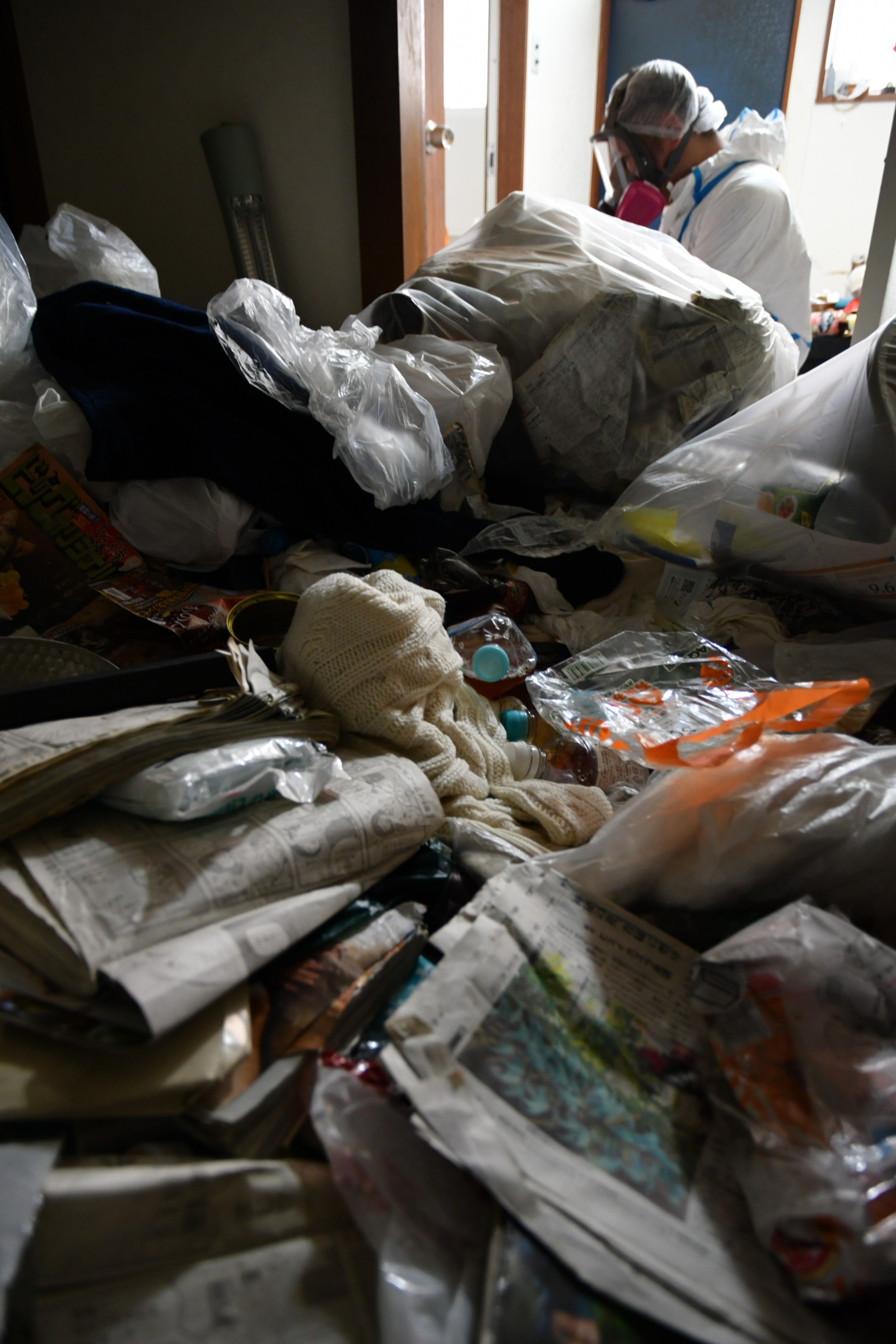 大量のごみ袋や新聞、衣類などで埋まった70代男性の室内を清掃するエヅリンの渡辺さん(奥)=9月上旬、宇都宮市