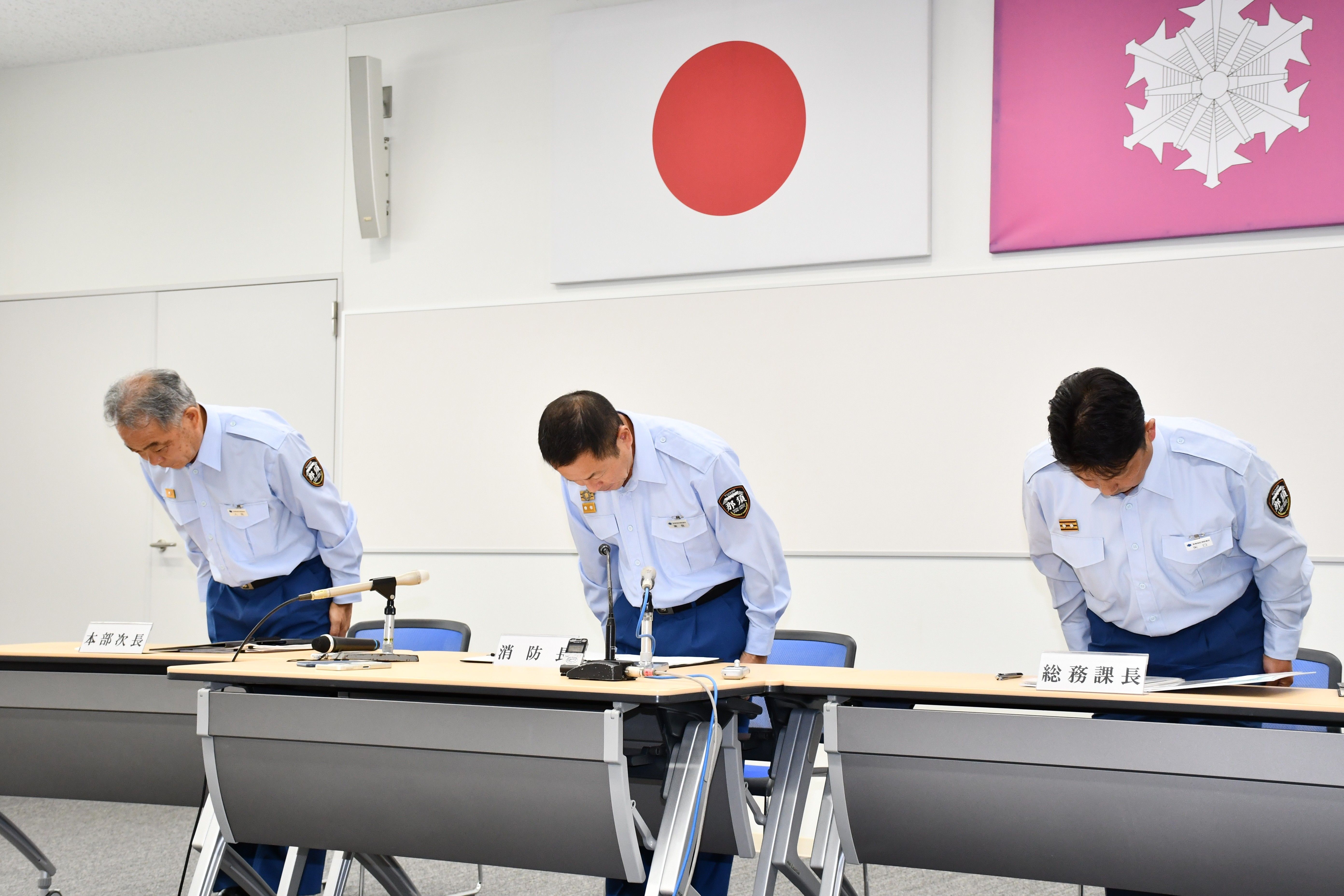 記者会見で謝罪する那須地区消防本部の東泉消防長(中央)=25日午前10時5分、大田原市中田原