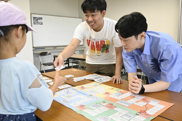 イベントで子どもにすごろくを体験してもらう今泉さん(右)と野々山さん=21日午前、壬生町本丸1丁目