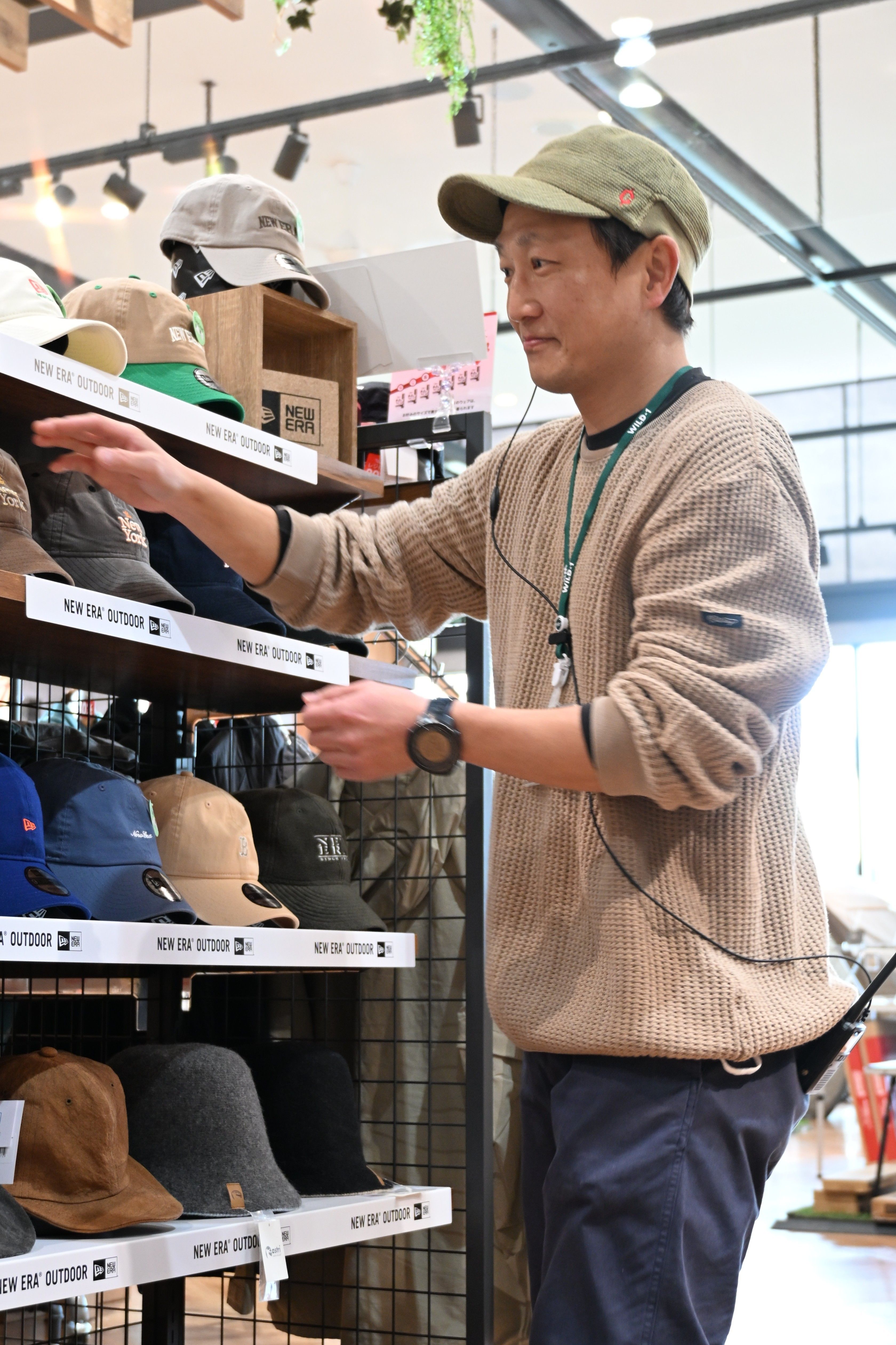 商品の帽子をかぶって勤務する高橋さん=12月下旬、ワイルドワン宇都宮西川田店