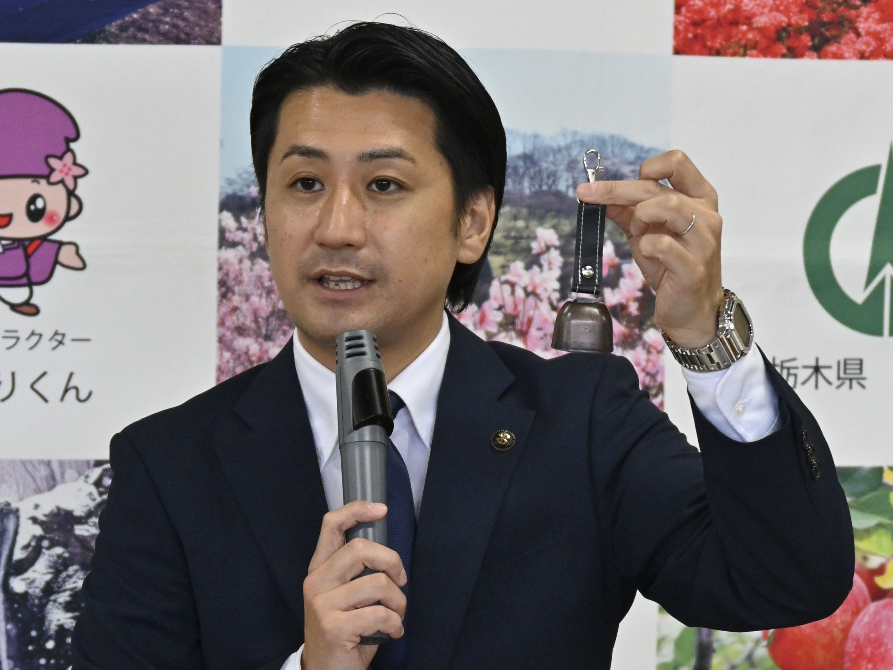 市内の小学生に配るクマよけの鈴を手に持つ森島市長