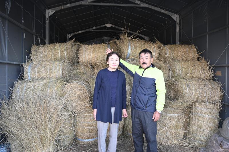 ユウガオの栽培で地面に敷くために保管するわらの束と葭葉さん夫妻