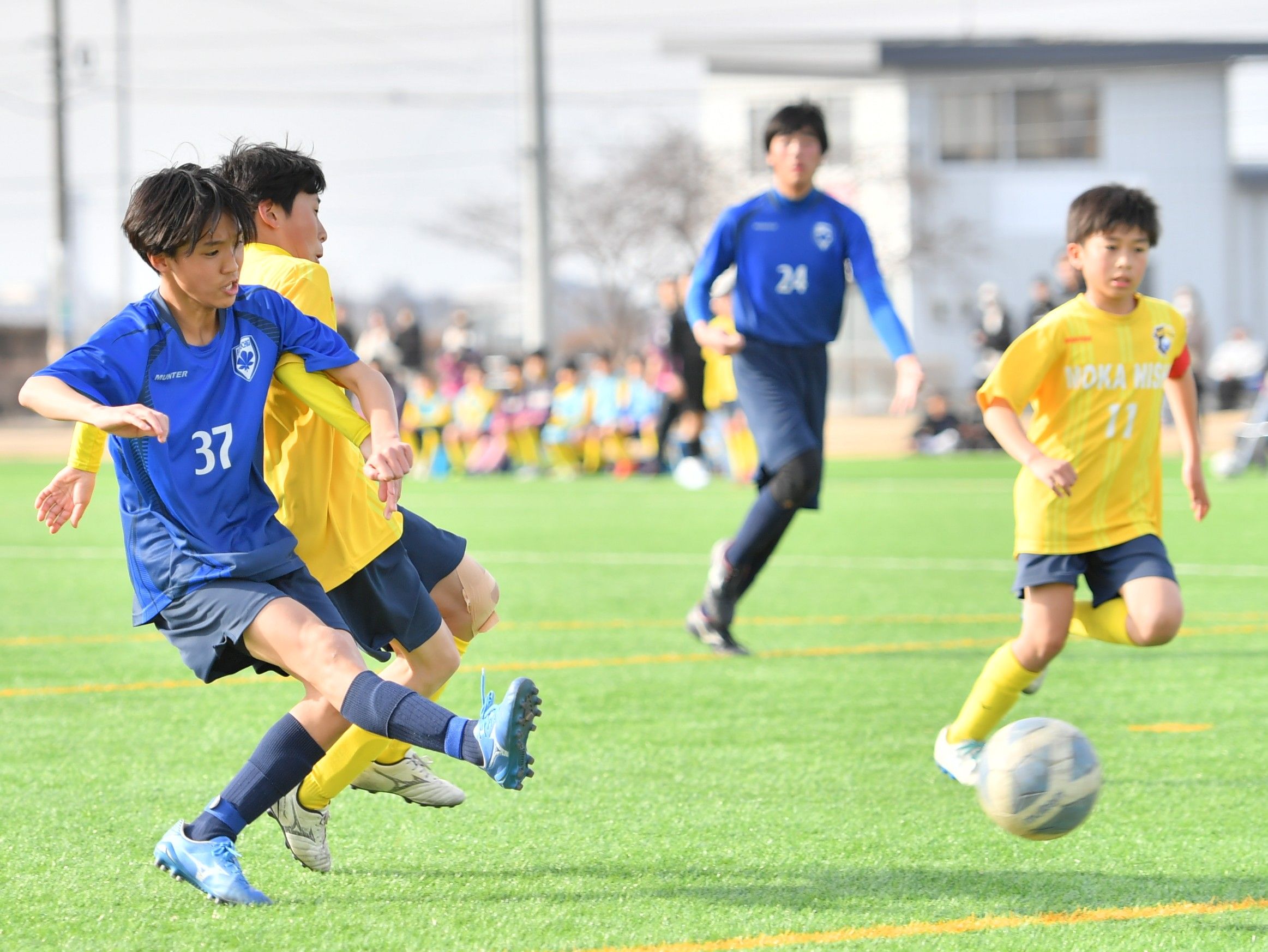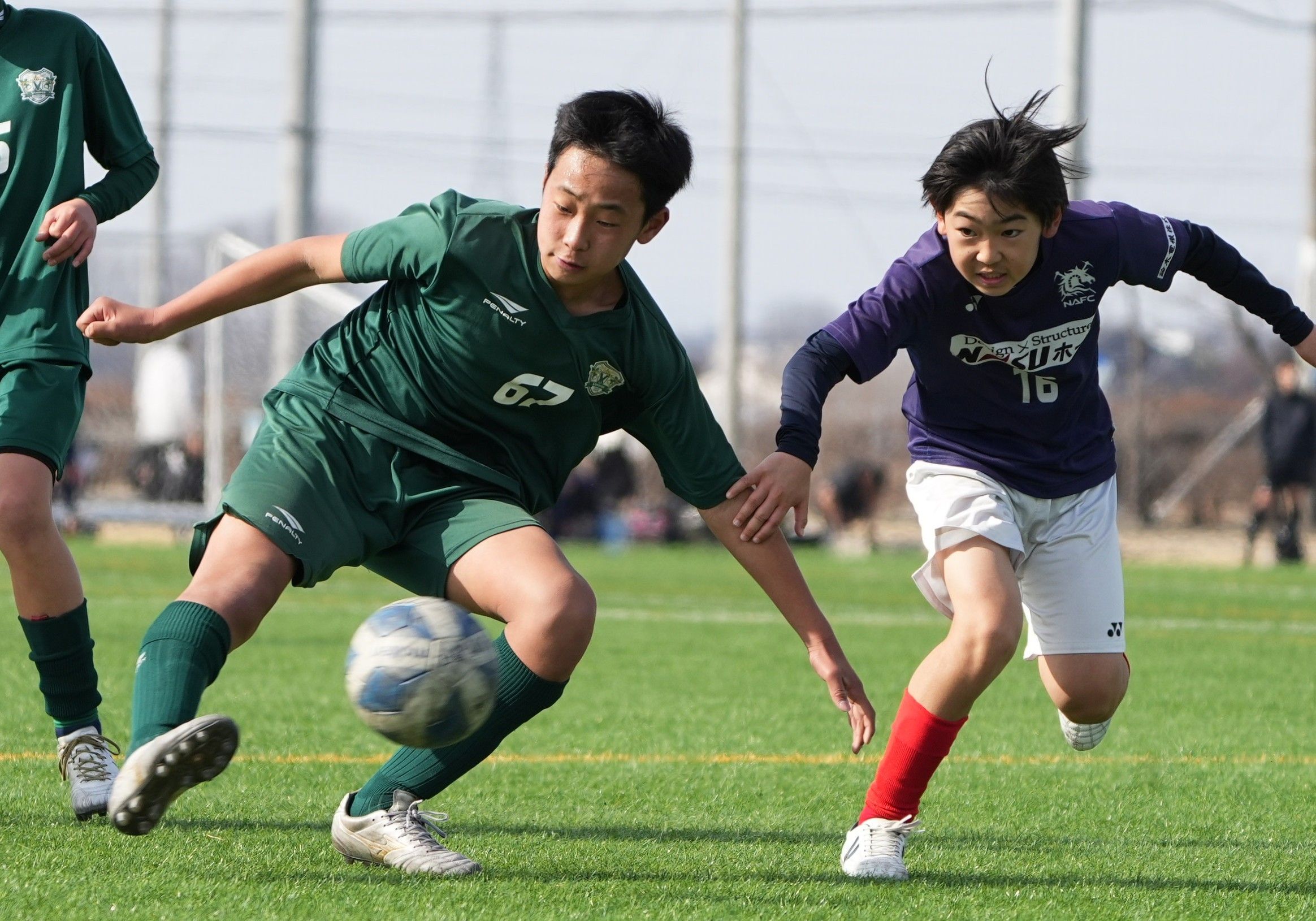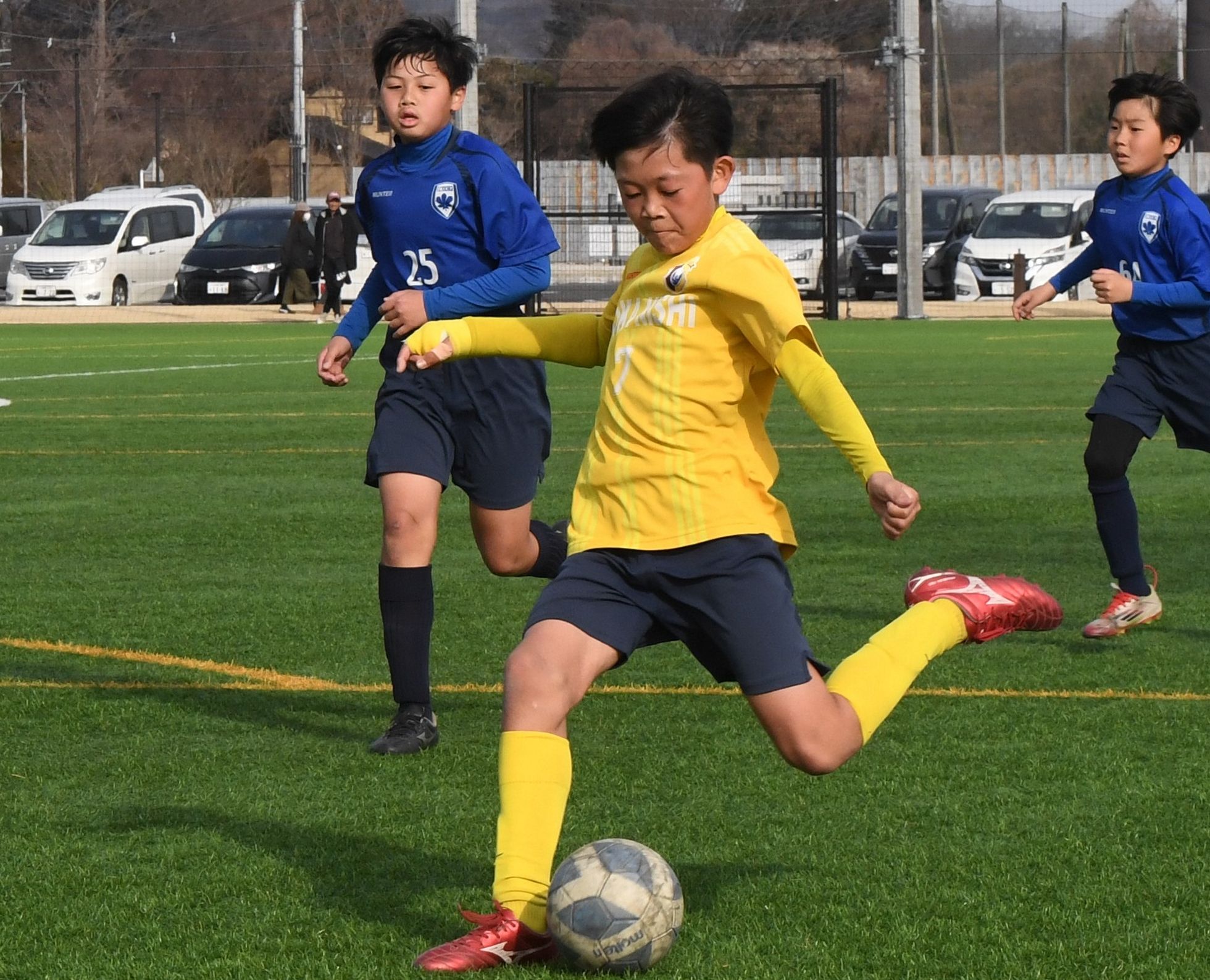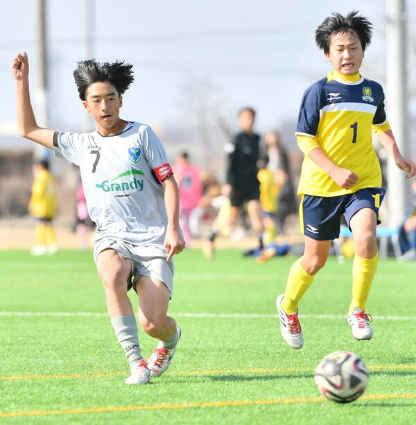 準々決勝 後半18分、ヴェルフェ矢板U12blanc(塩南)のFW小川(左)がゴールを決める=真岡ハイトラ運動公園運動広場、橋本裕太撮影