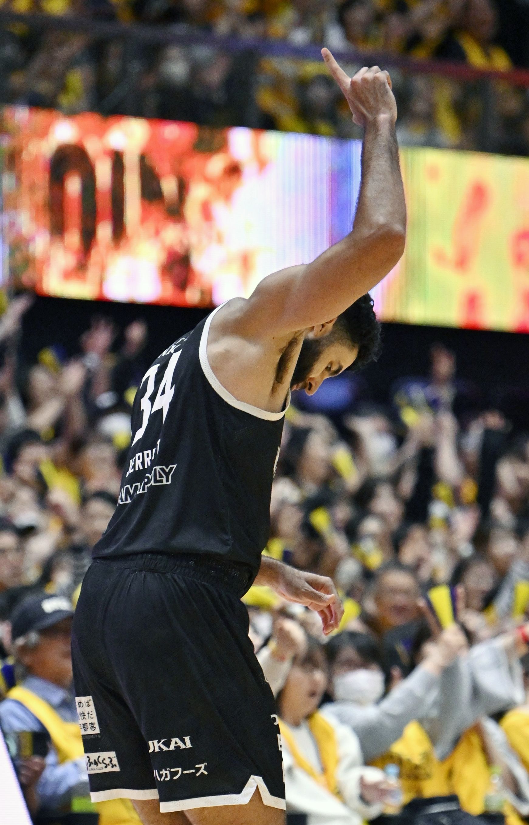 第4クオーター7分、ブレックスのジェレットが3点シュートを決め、天を指差す=ブレックスアリーナ宇都宮、森田大地撮影