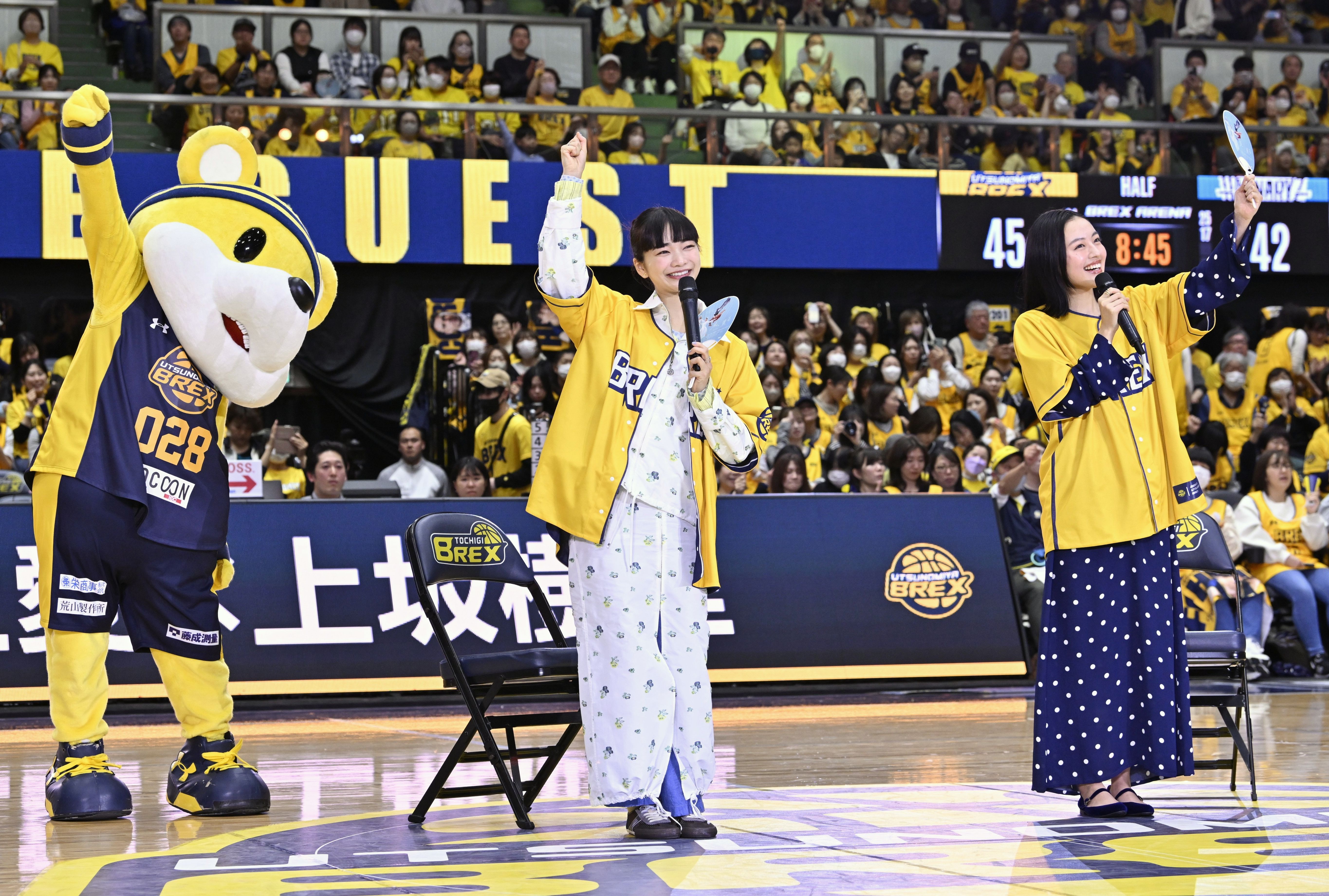 ハーフタイムに登場した見上さん(中央)と上坂さん(右)=森田大地撮影