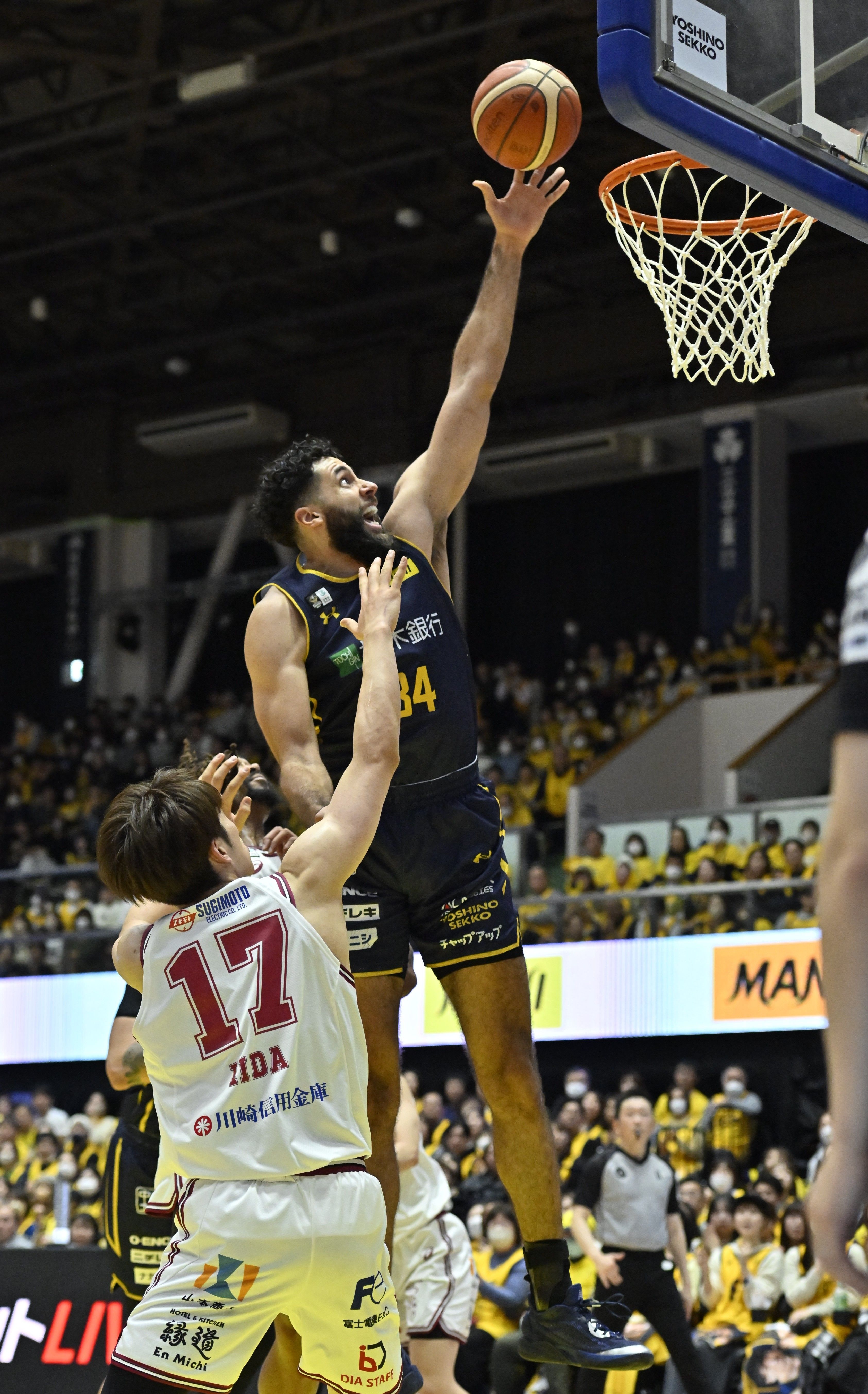第2クオーター5分、ブレックスのジェレットがゴール下でシュートを決める=ブレックスアリーナ宇都宮