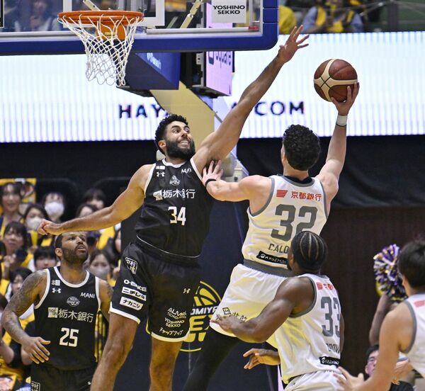 第4クオーター1分、ブレックスのジェレットがブロックを狙う=ブレックスアリーナ宇都宮、森田大地撮影