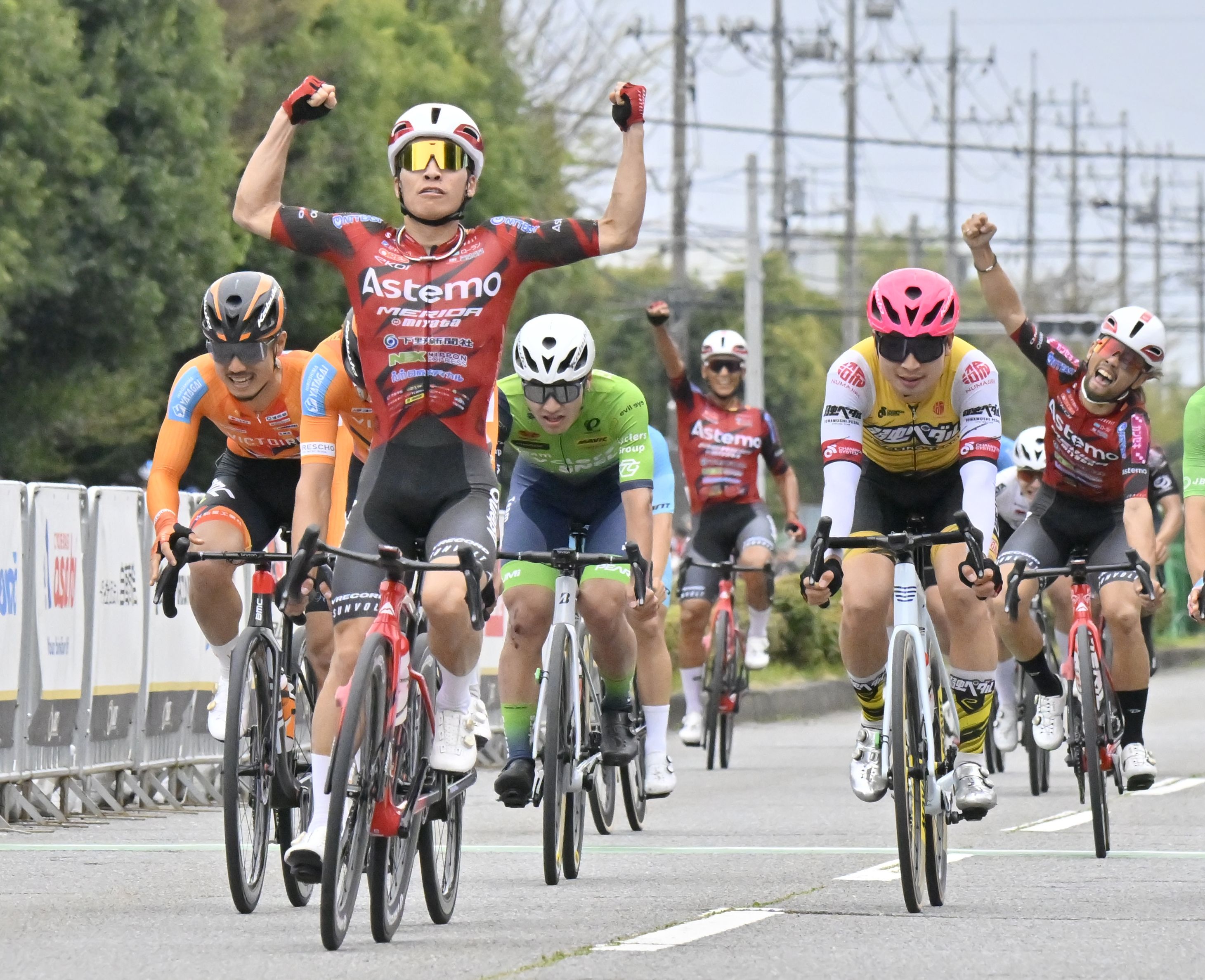 ゴールスプリントを制しガッツポーズするブリッツェンの岡(左手前)。右は武山、奥中央はフォン=清原工業団地周辺周回コース、加藤竜矢撮影