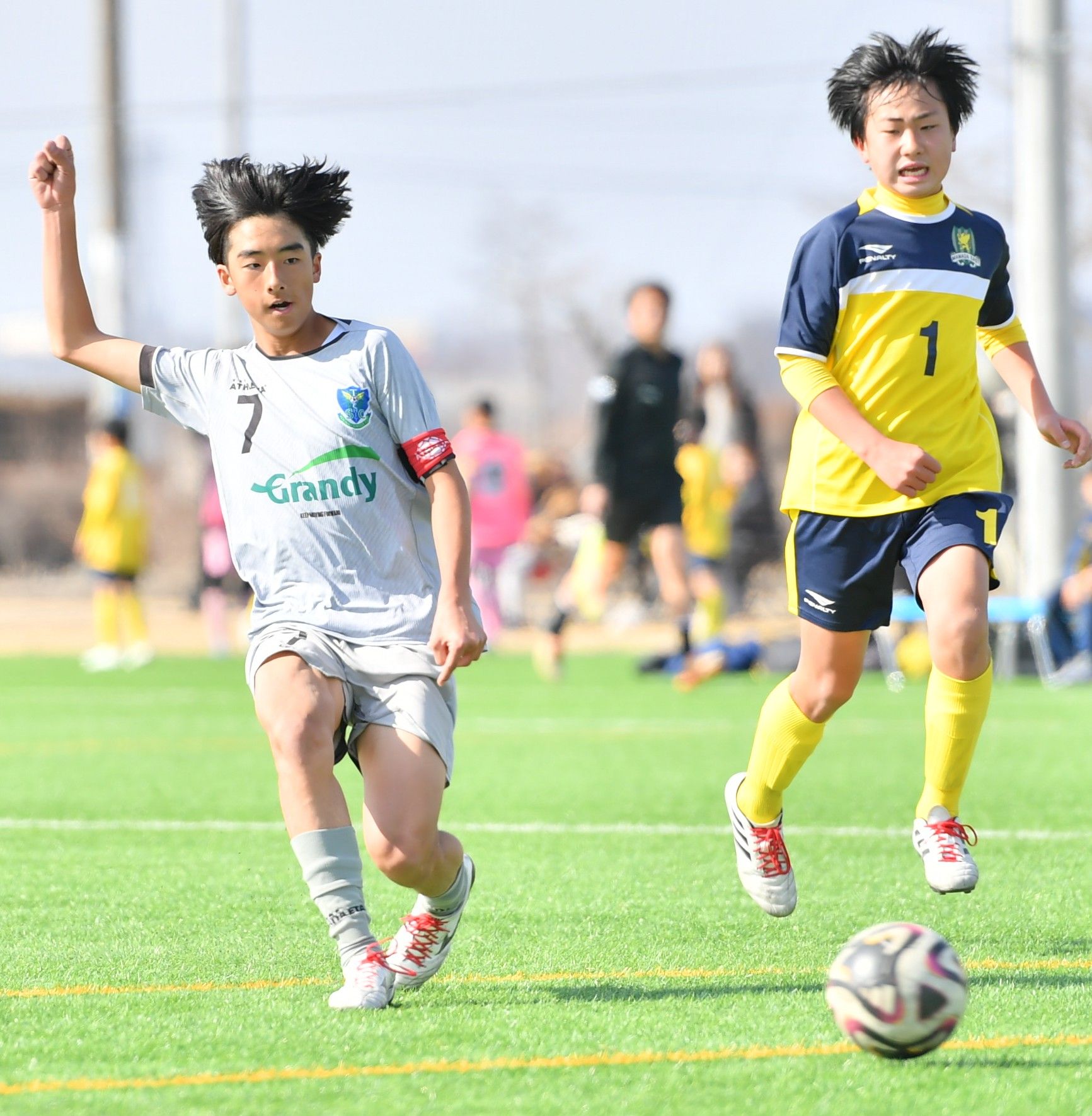 後半7分、FC栃木(下都賀)のMF生澤(左)が2点目を決める=真岡ハイトラ運動公園運動広場