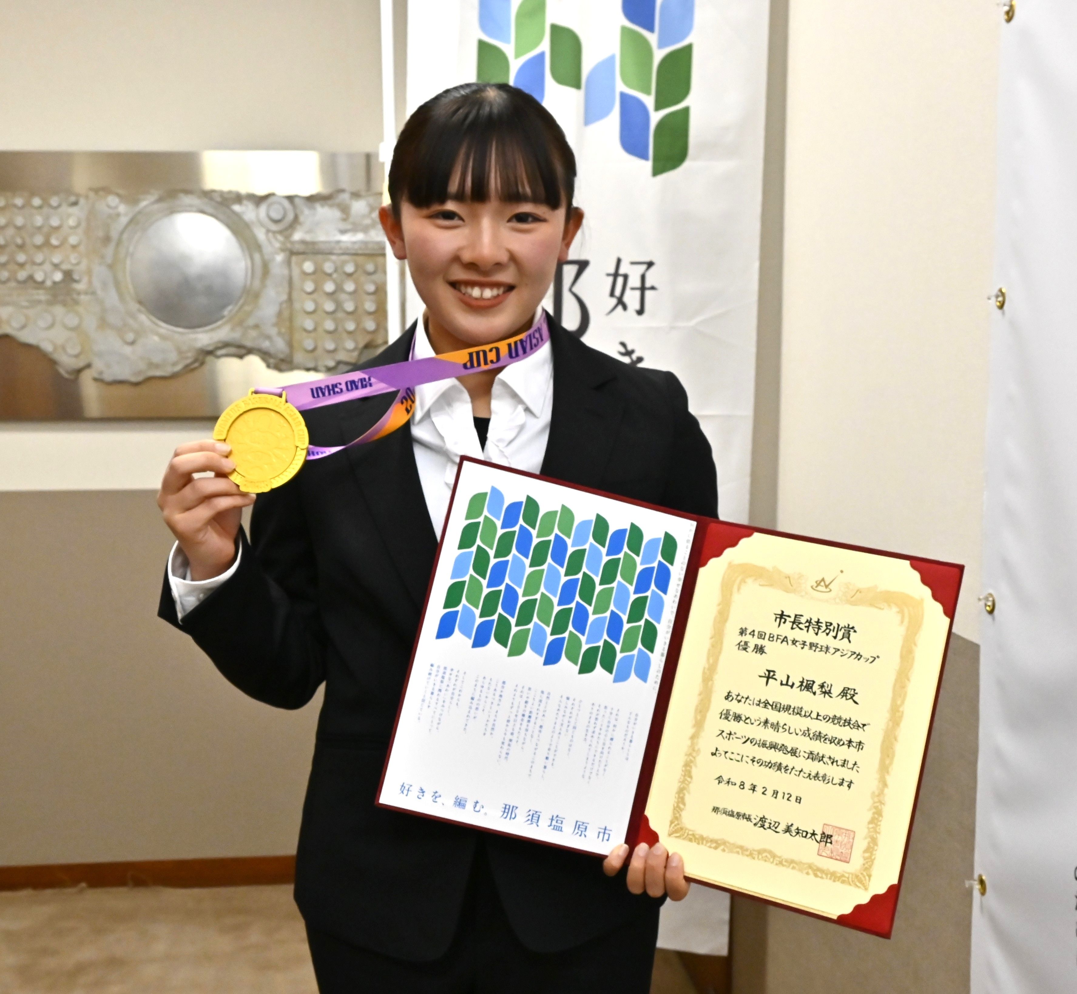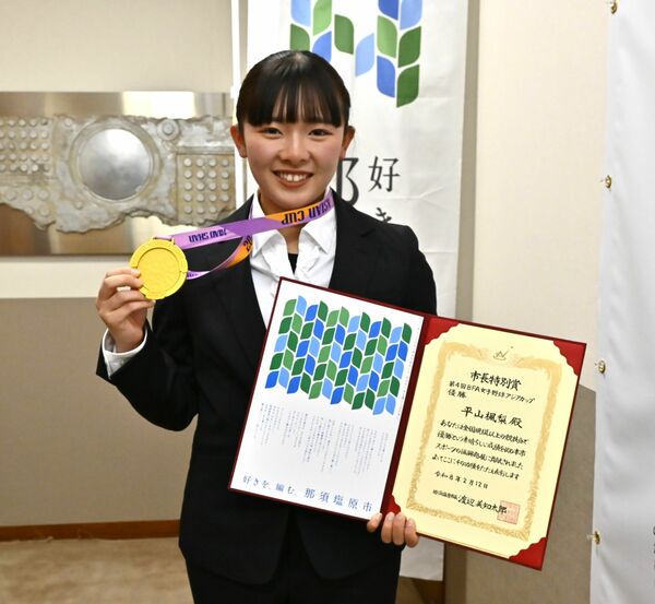 優勝メダルと市長特別賞の賞状を手に笑顔を見せる平山さん
