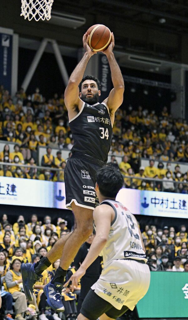 第4クオーター8分、ブレックスのジェレットがシュートを決める=ブレックスアリーナ宇都宮、森田大地撮影