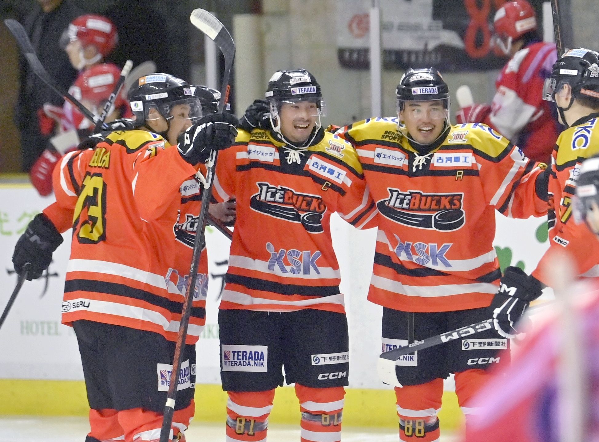 第3ピリオド1分48秒、バックスのFW鈴木健(中央)が通算100点目となるゴールを決め、仲間と歓喜する=日光霧降アイスアリーナ