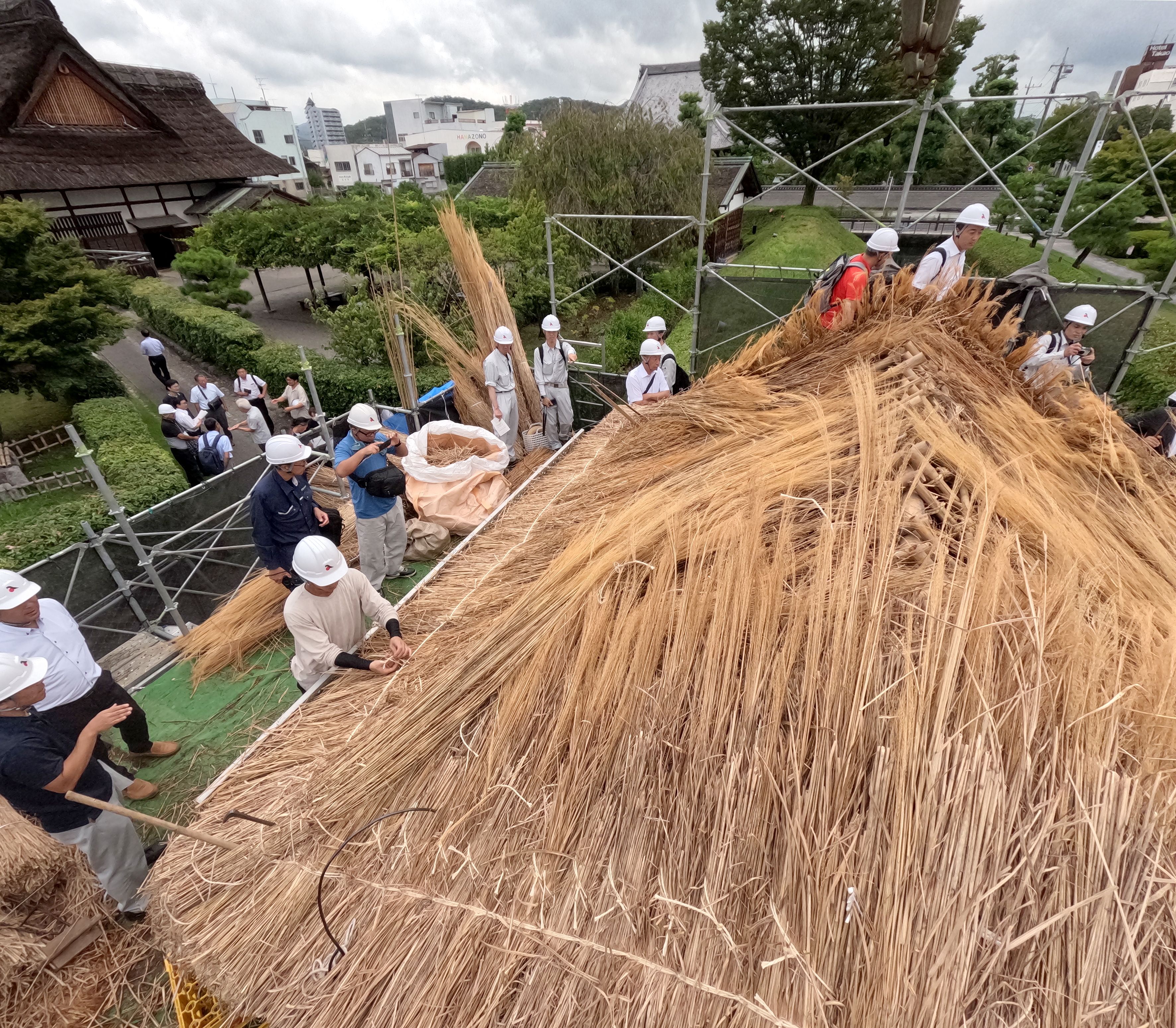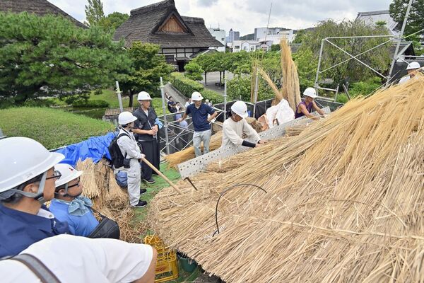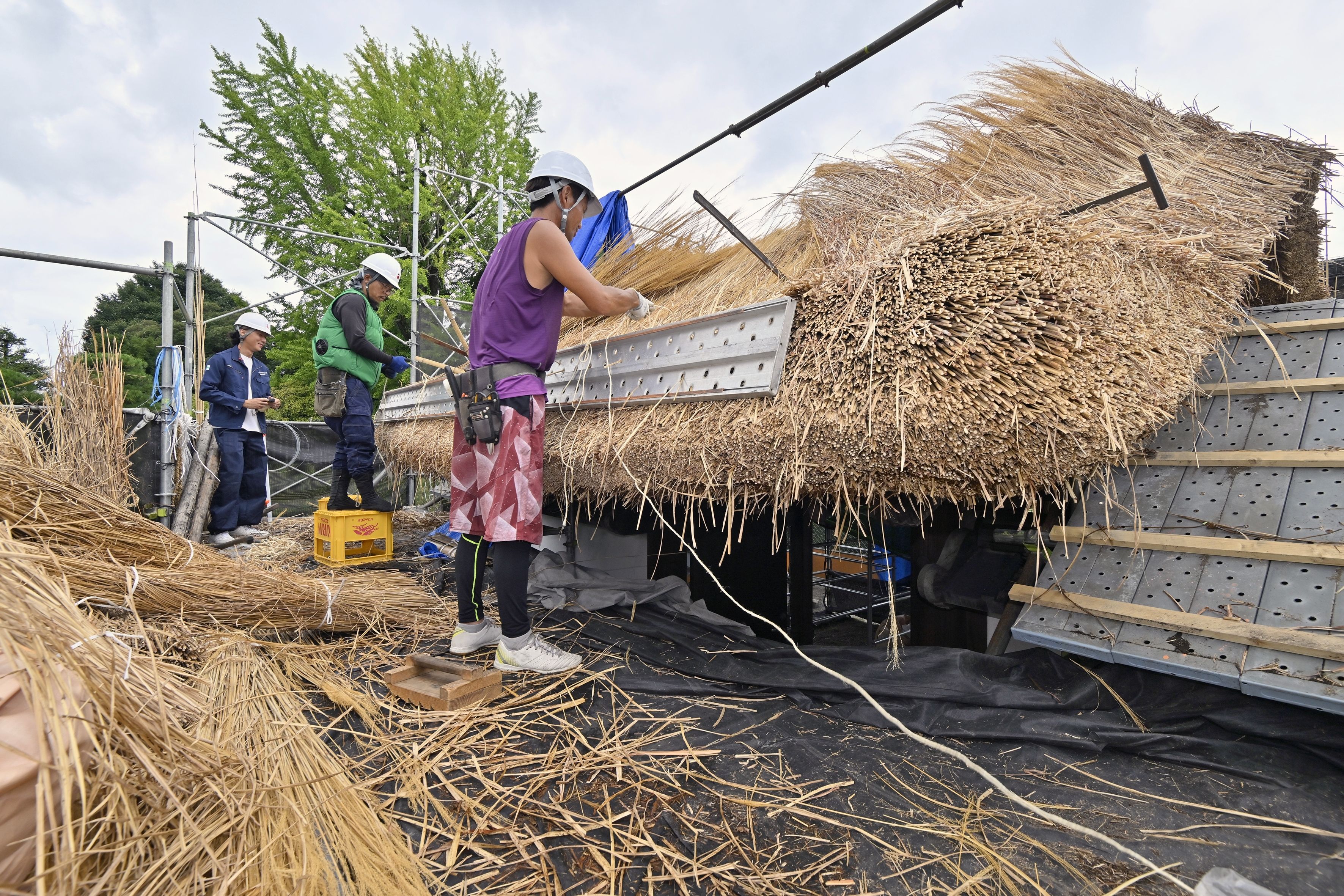 裏門屋根の葺き替え作業を見学する職人ら=12日午前9時25分、足利市昌平町