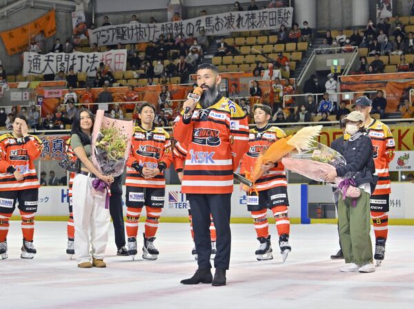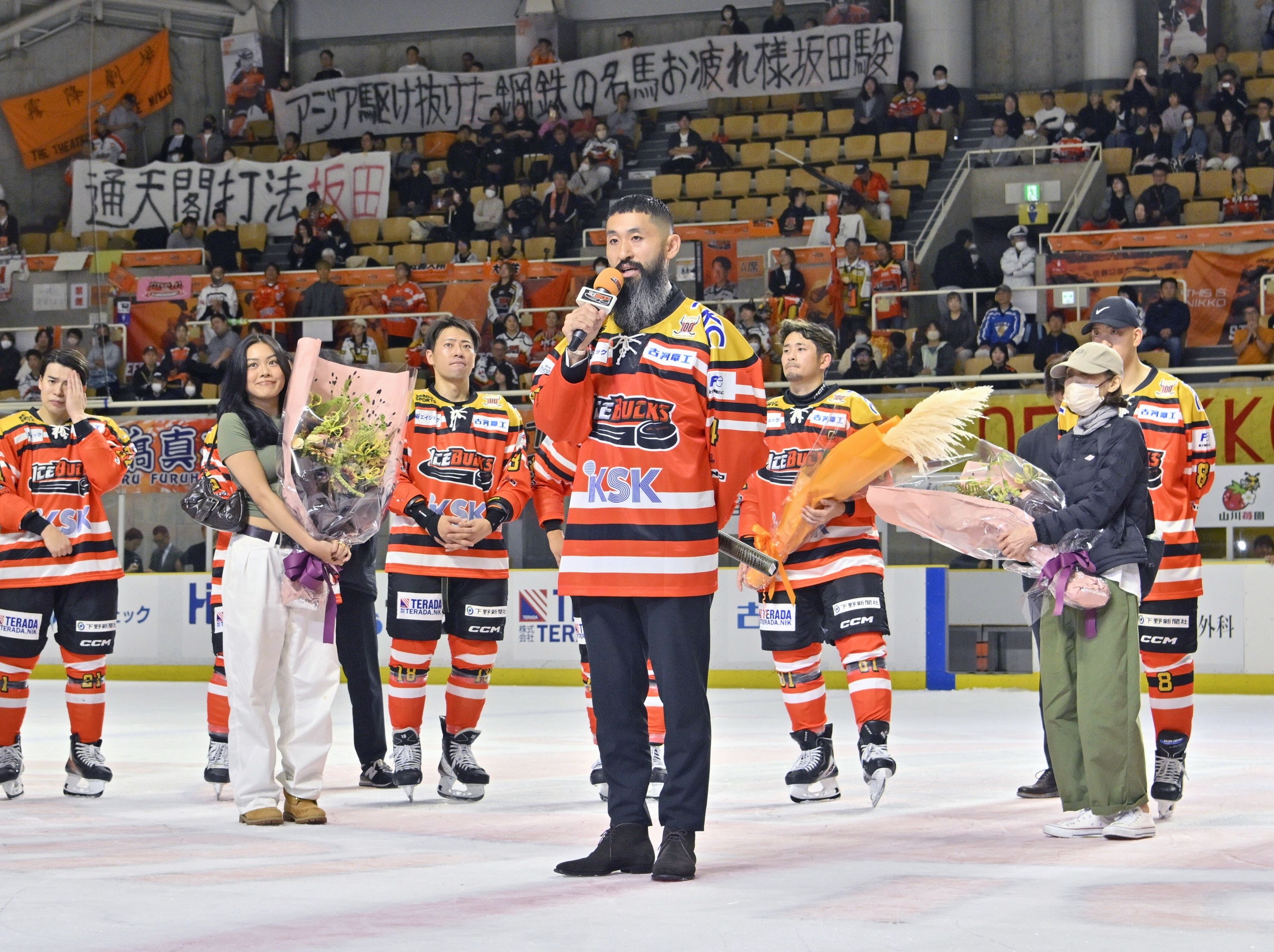 試合後の引退セレモニーでファンや家族への感謝を述べる坂田