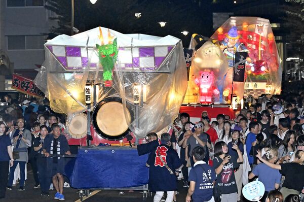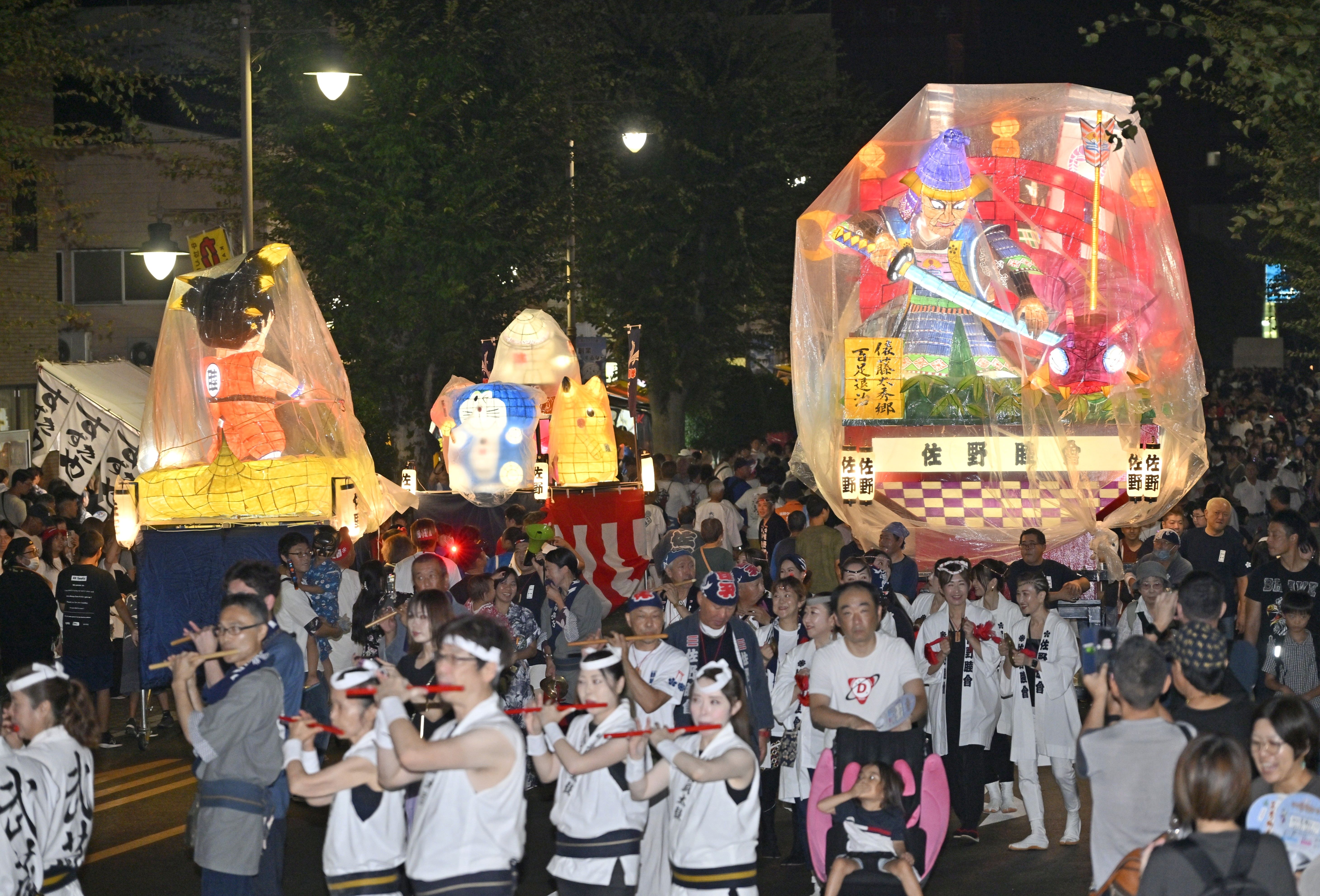 さの秀郷まつりで繰り広げられた「ねぶた巡行」=13日午後7時50分、佐野市高砂町
