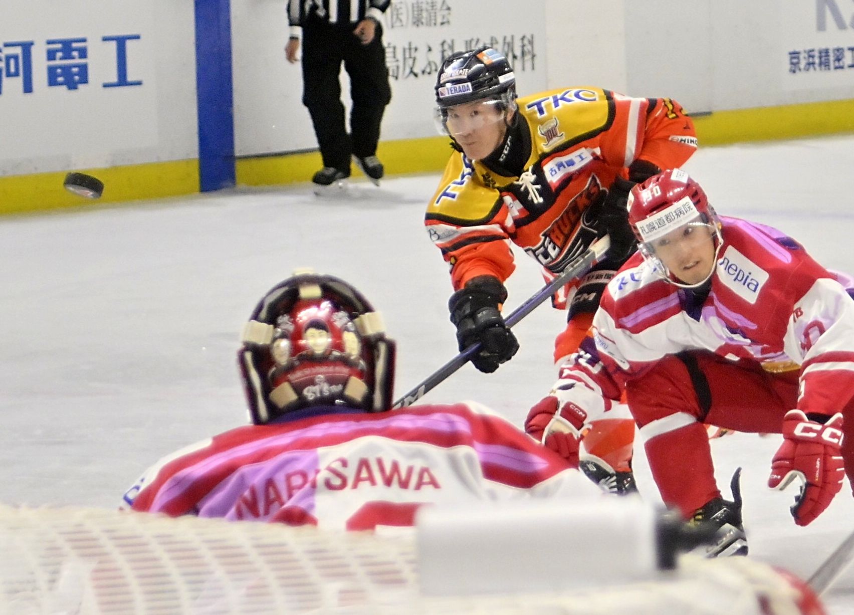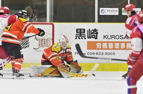 第2ピリオド18分、バックスの大塚が相手シュートをセーブする=日光霧降アイスアリーナ