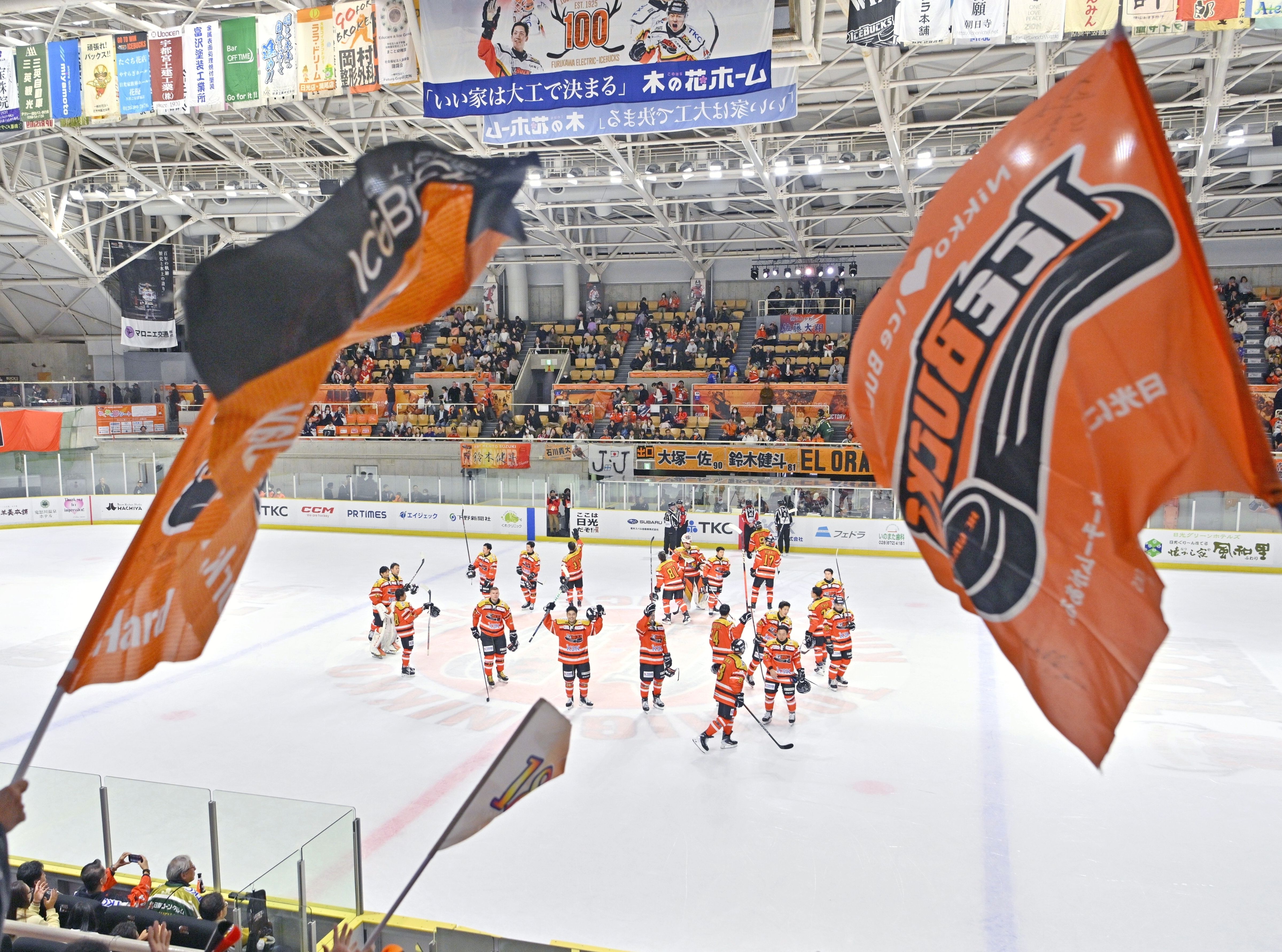 開幕戦で勝利を収め、ファンの声援に応えるバックスの選手たち=13日午後4時25分、日光霧降アイスアリーナ、広瀬華撮影