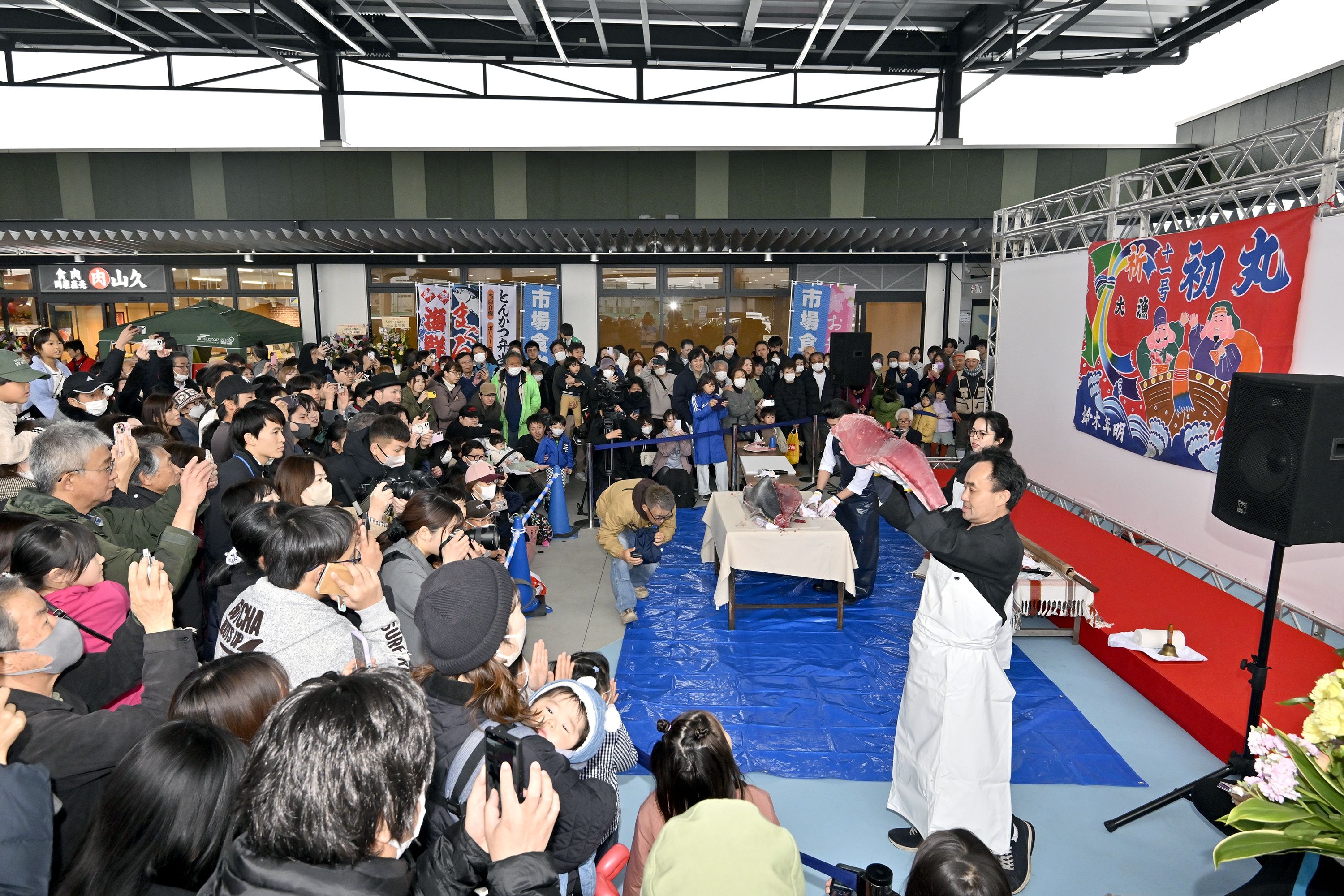 「食の広場」に集まった大勢の来場客の前で行われた本マグロの解体ショー