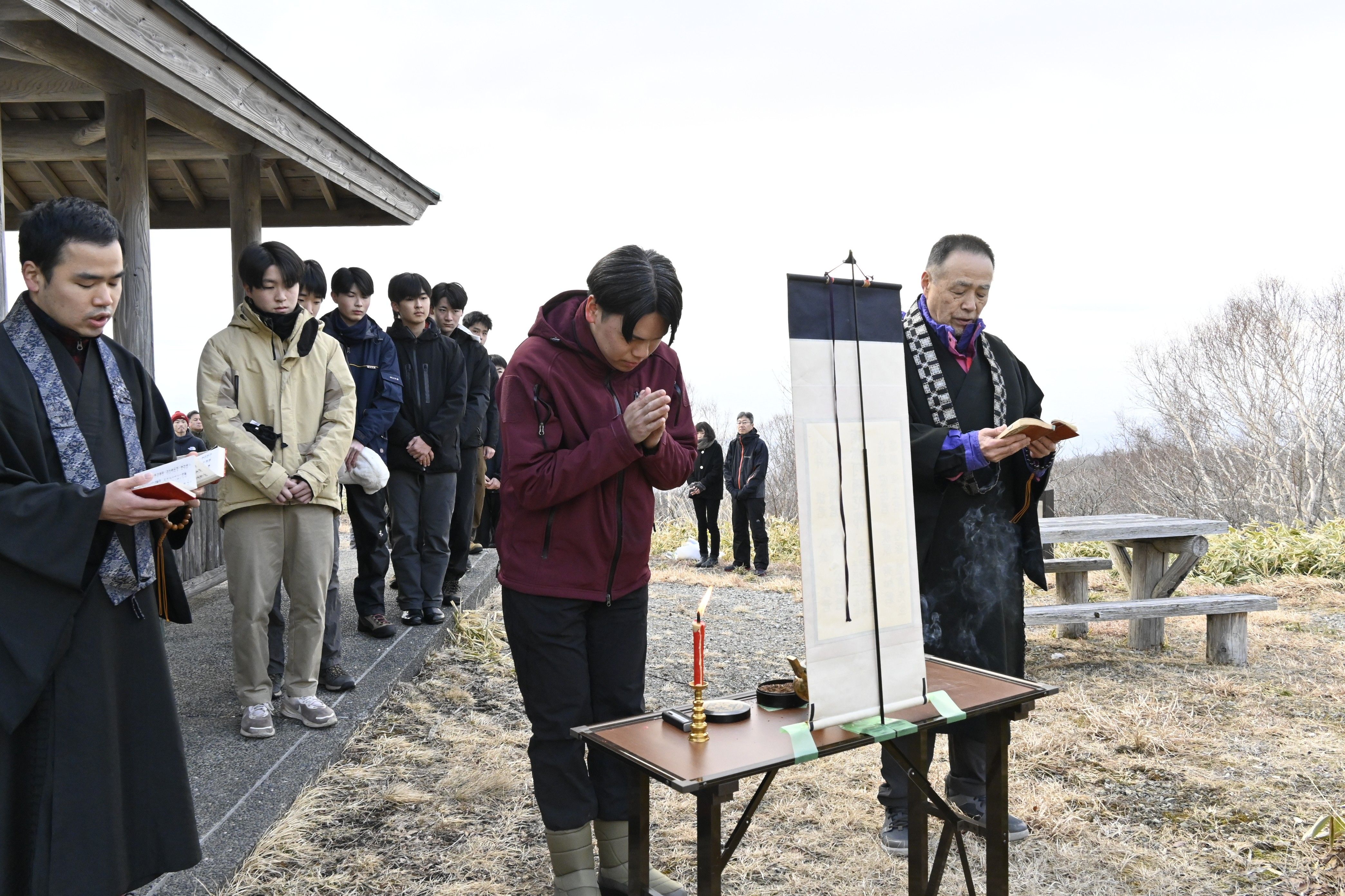 亡くなった8人の冥福を祈り手を合わせる参列者=20日午前7時10分、那須町湯本
