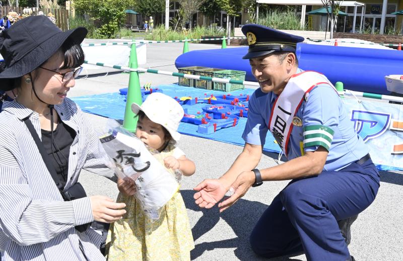 交通安全を呼びかける神山さん(右)=21日午前、小山市喜沢