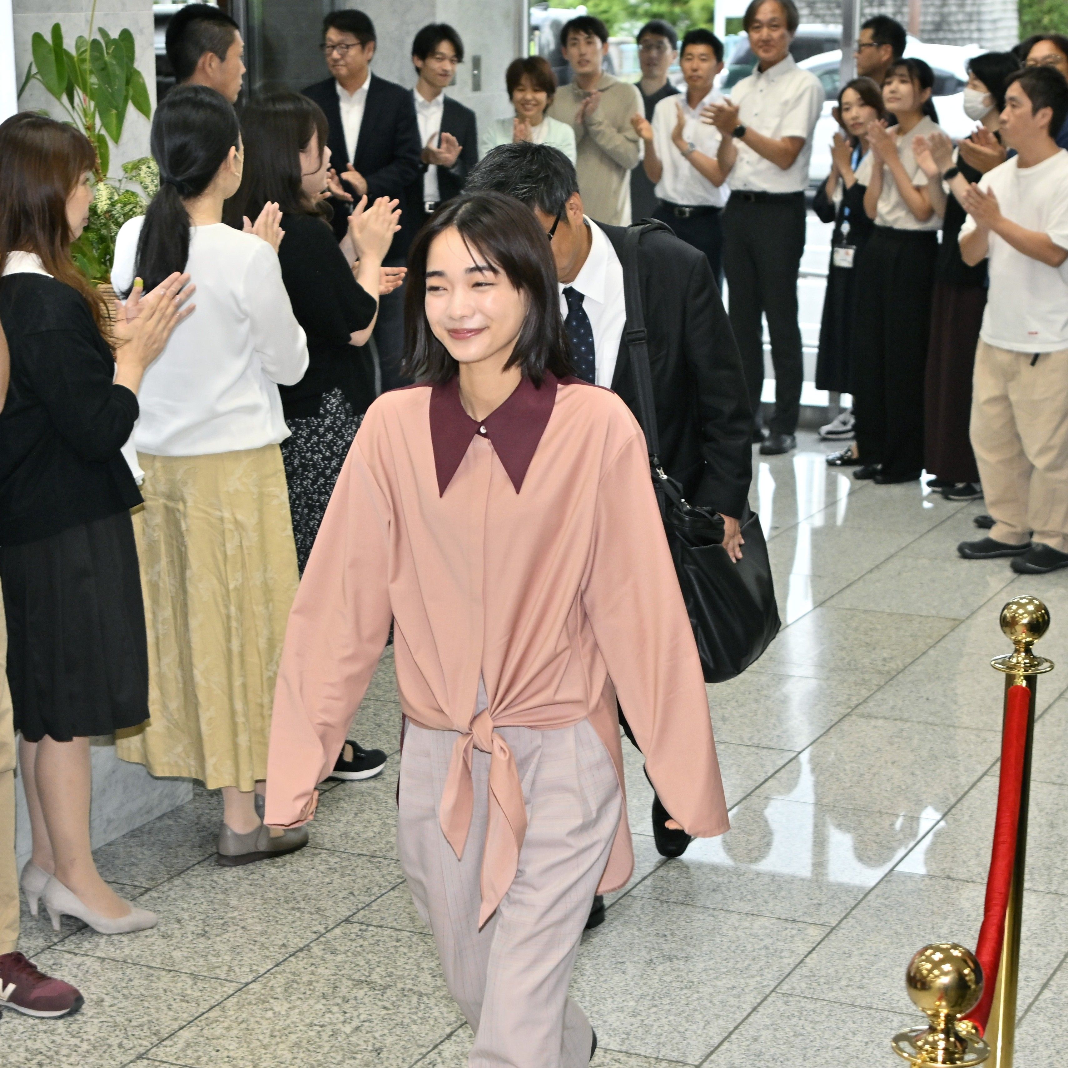 下野新聞社社員らの歓迎を受ける見上さん(中央)=22日午後4時、同社