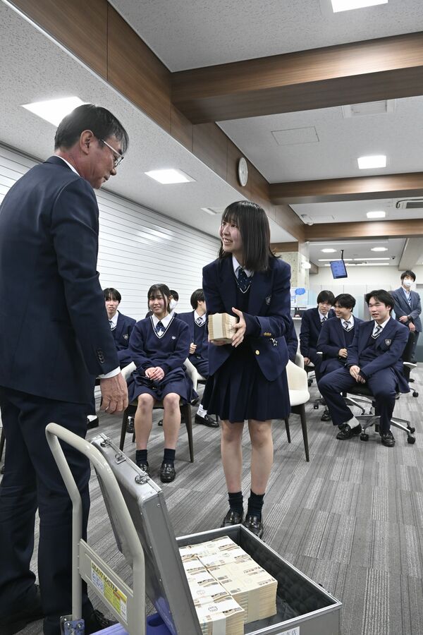 1億円が入ったケースから札束を手にする生徒=宇都宮市