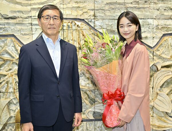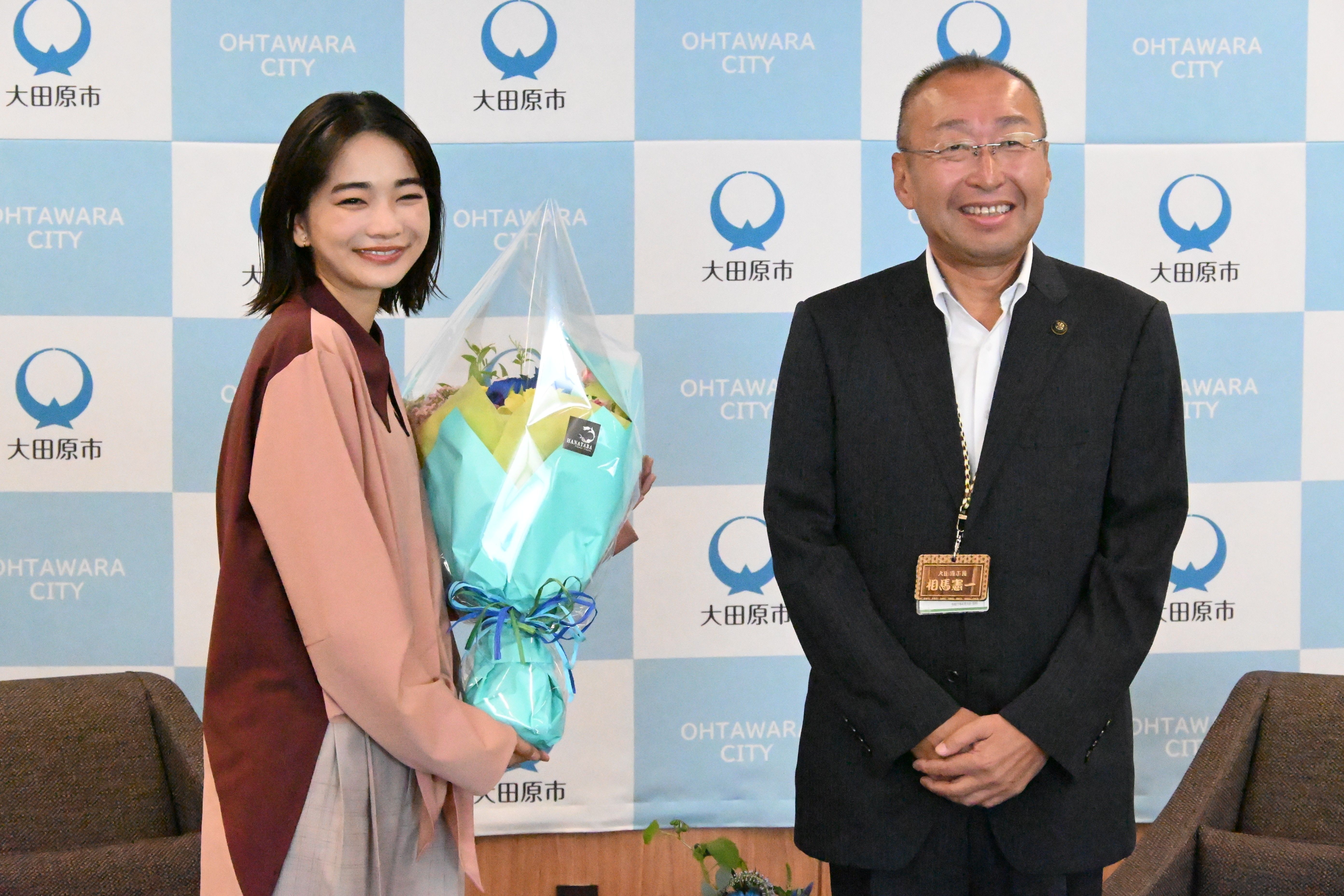 福田知事(右)と懇談する見上さん=22日午後、栃木県庁相馬憲一市長(右)を表敬訪問した見上愛さん=22日午前、大田原市役所花束を手にした見上さん=22日午後4時、宇都宮市昭和1丁目