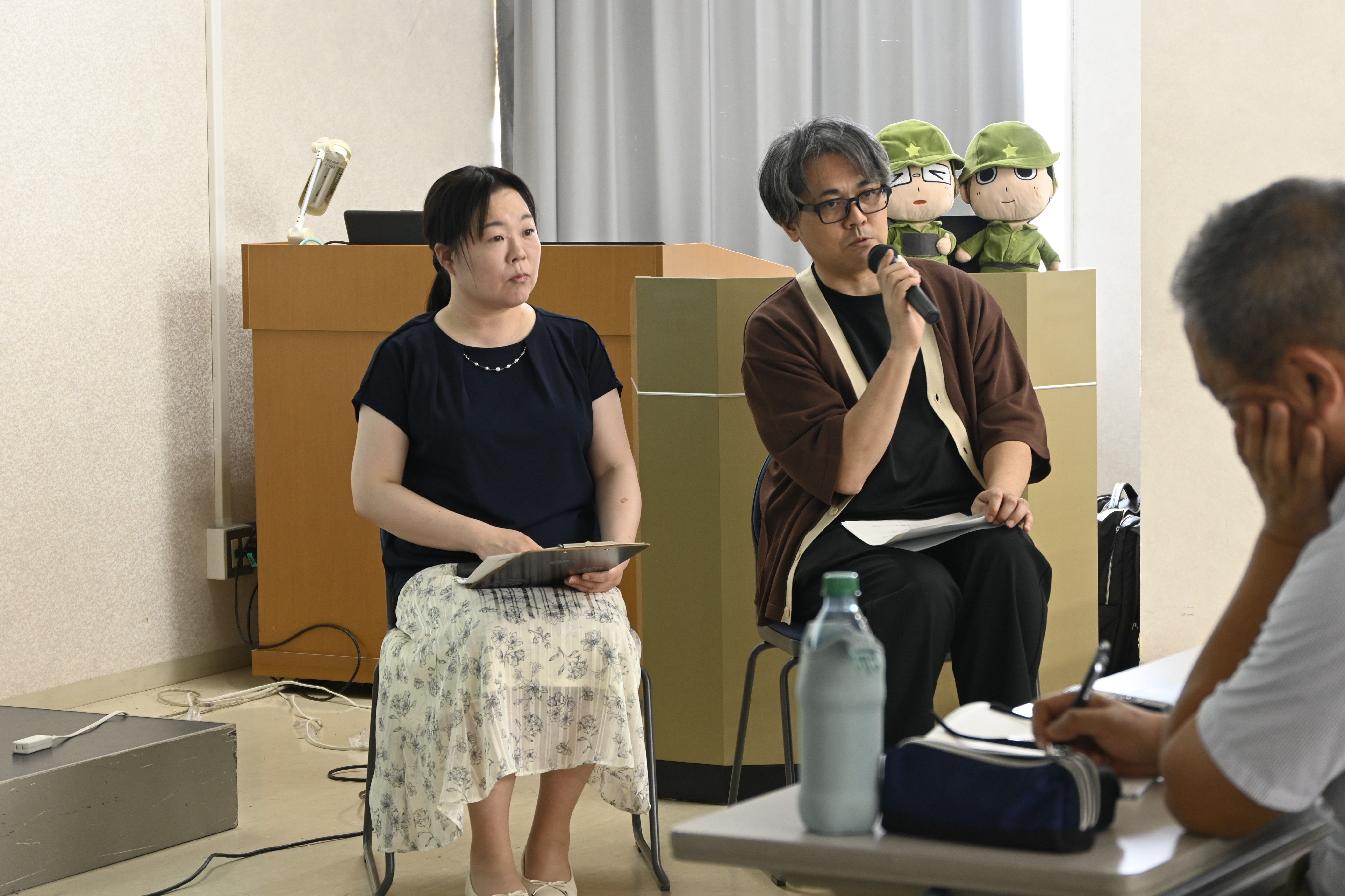 表現活動を通じた戦争の記憶の継承について意見を交わす武田さん(右)と小栁さん=22日午後、宇都宮市上戸祭4丁目