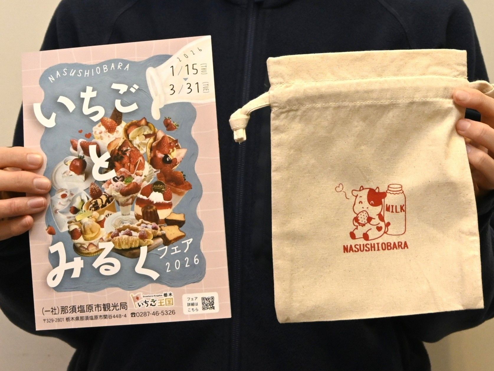 いちごとみるくフェアのチラシとオリジナルポーチ