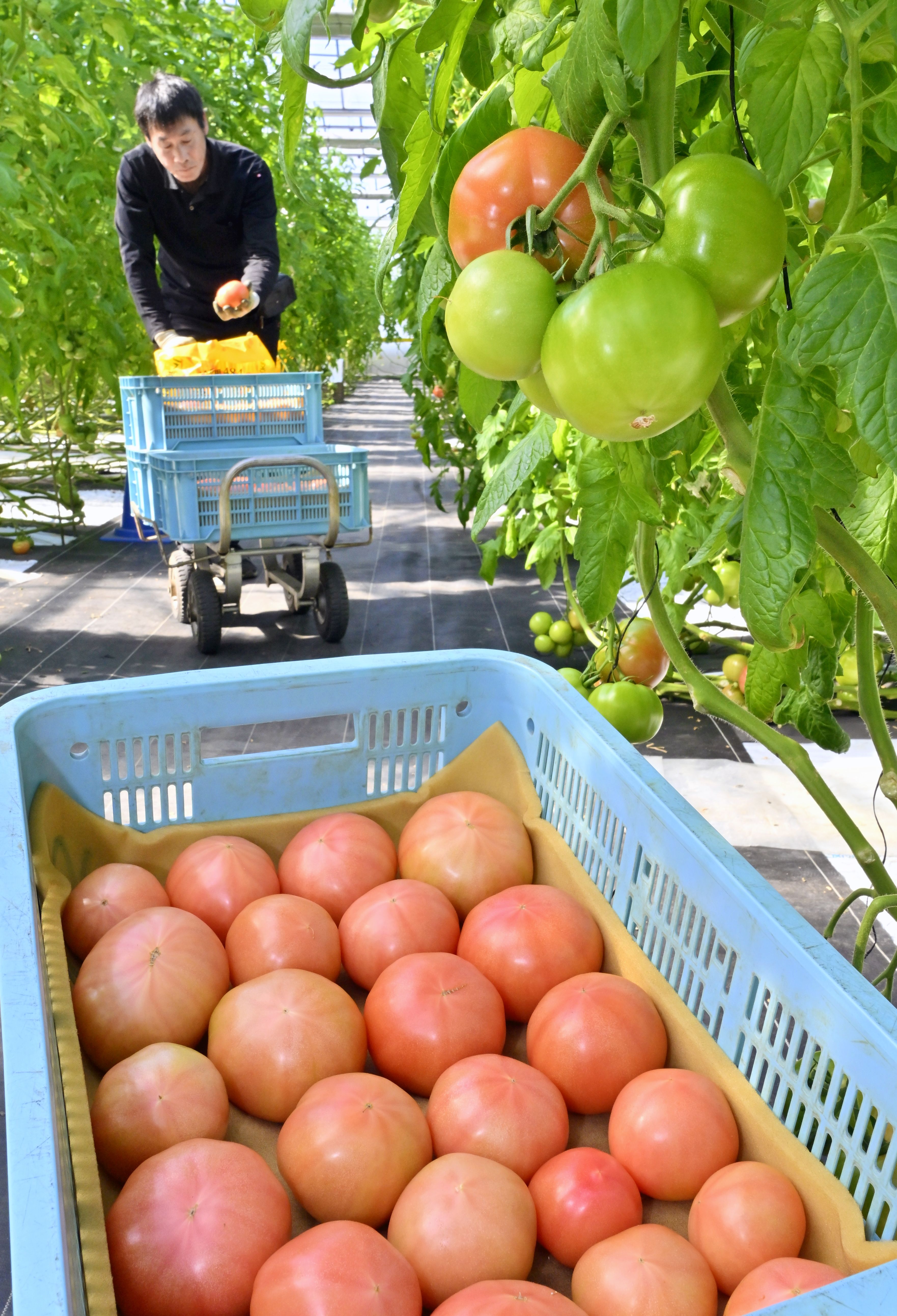 収穫される赤く色づいたトマト=12日午前11時5分、足利市小曽根町
