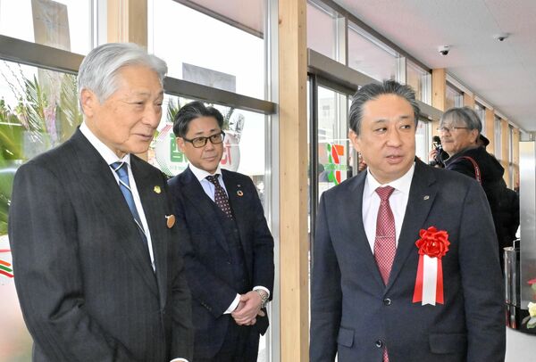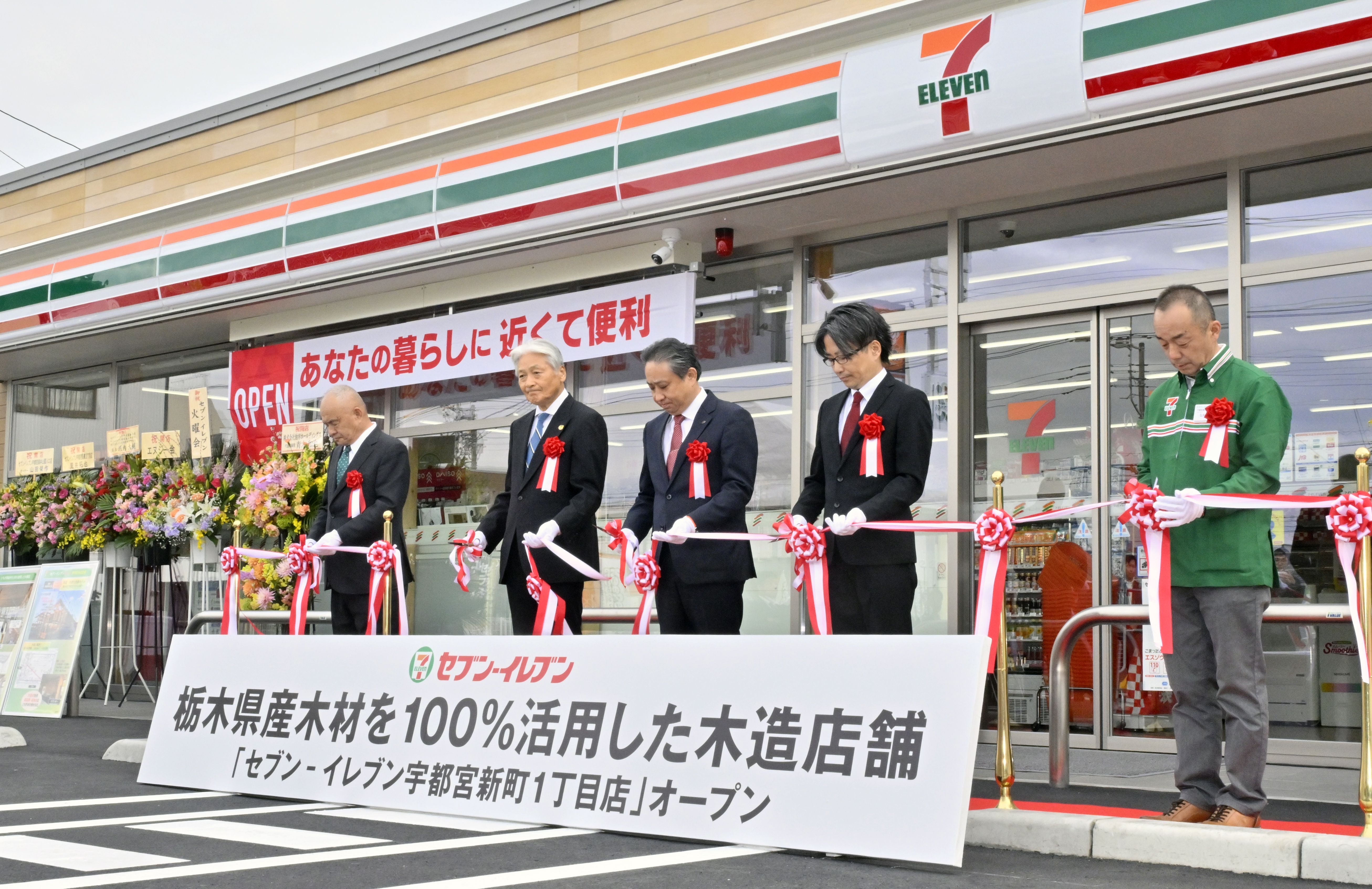 店舗前でテープカットする福田知事(左から2人目)とセブン-イレブン・ジャパンの阿久津社長(中央)ら=11日午後2時15分、宇都宮市新町1丁目