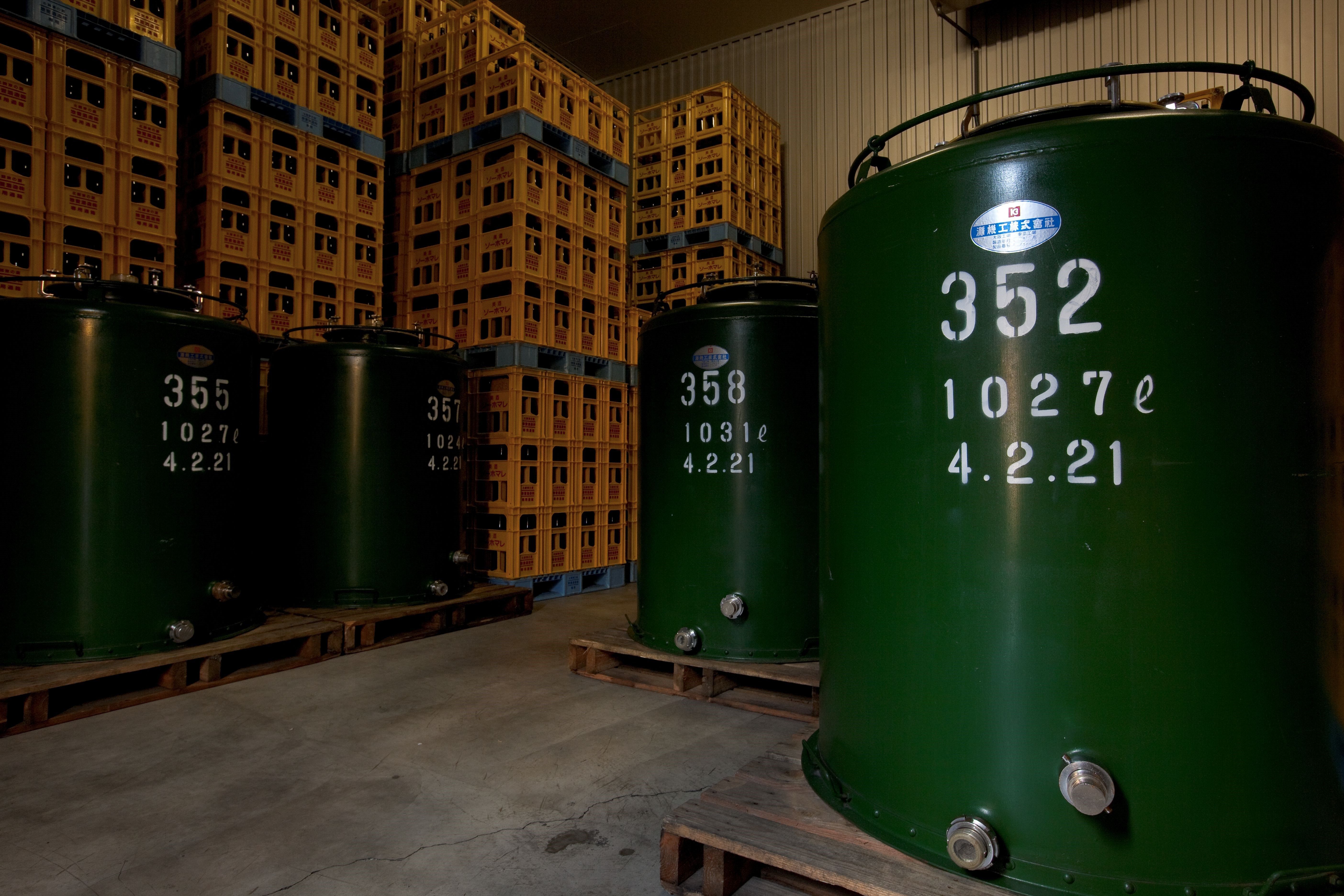 3年分の酒が瓶詰めやタンクで貯蔵される冷蔵倉庫内