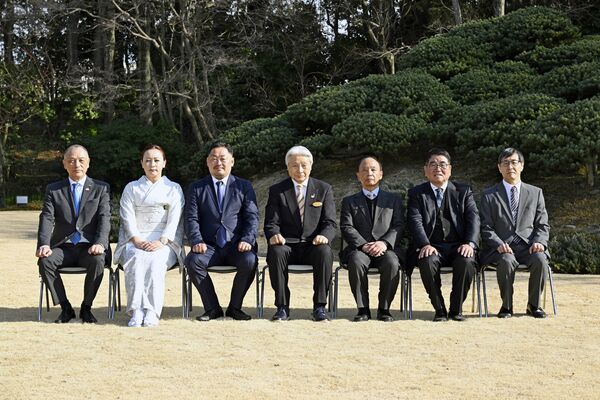 大賞に輝いた「雄」の代表者(左から2、3人目)と「道の駅東山道伊王野」の代表者(同5、6人目)ら=6日午後、県公館、森田大地撮影