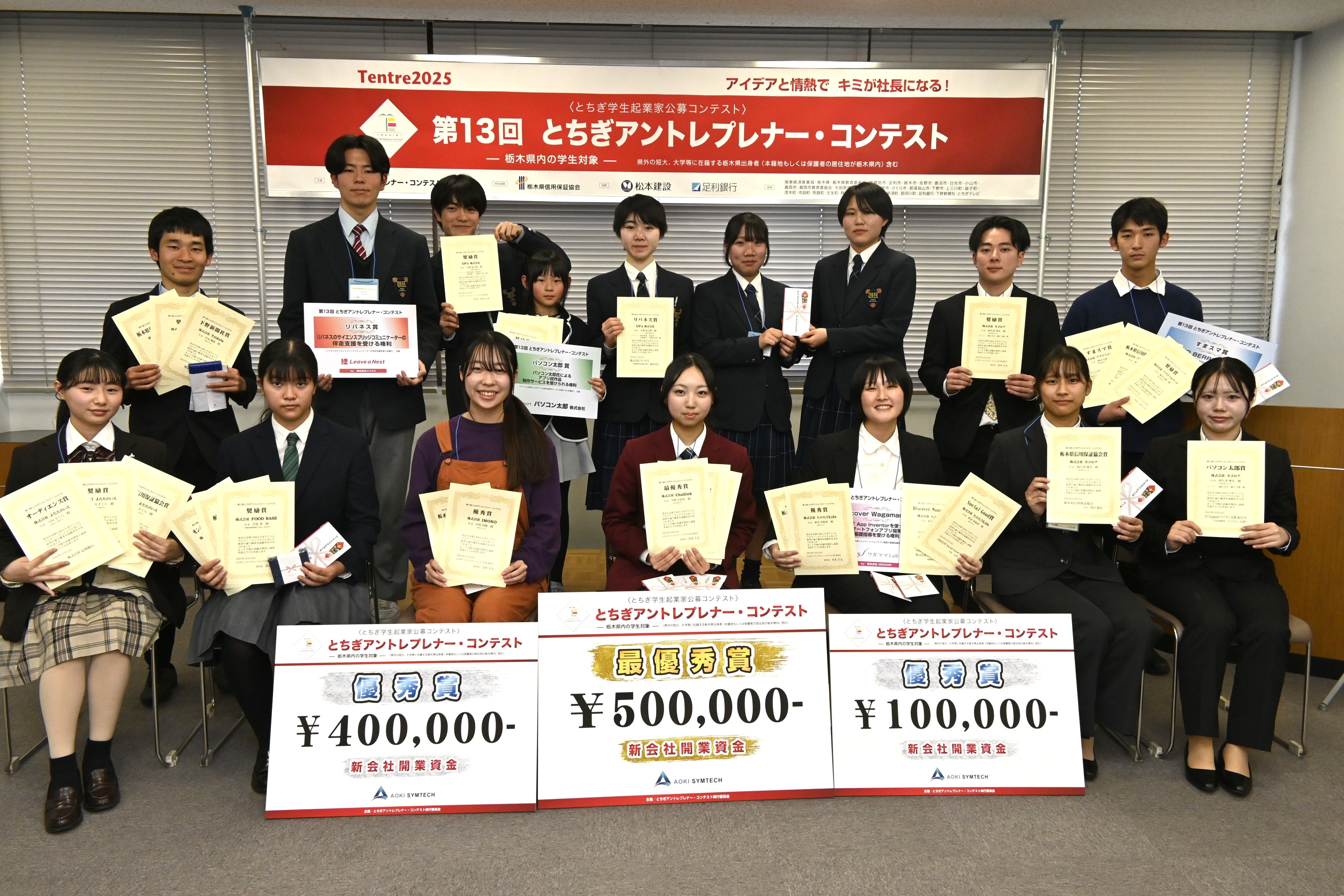 最優秀賞に輝いた久野さん(前列中央)と最終選考会の参加者=13日午後、下野新聞社