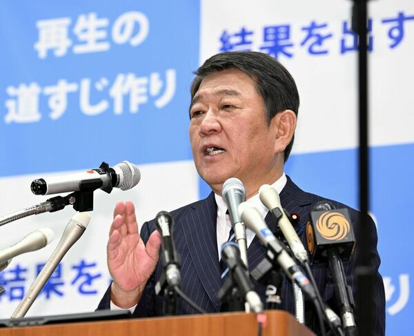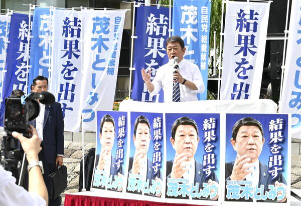 総裁選の告示日にJR新橋駅前で第一声を放つ茂木氏=22日午前、東京都港区